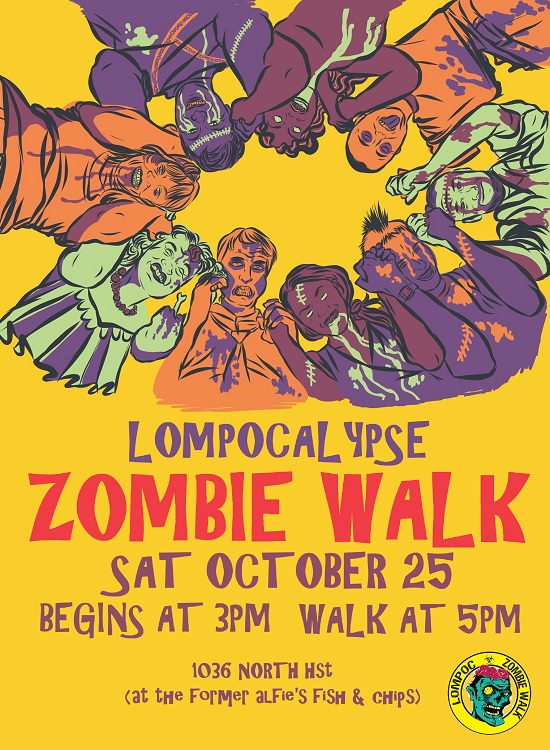 The Recently Revived Lompoc Zombie Walk brings Free Family Fun to Hst. October 25 @ 3pm, the Dead will rise and shamble from 1036 North H St to Jupiter Sparks and Centennial Park on South H.