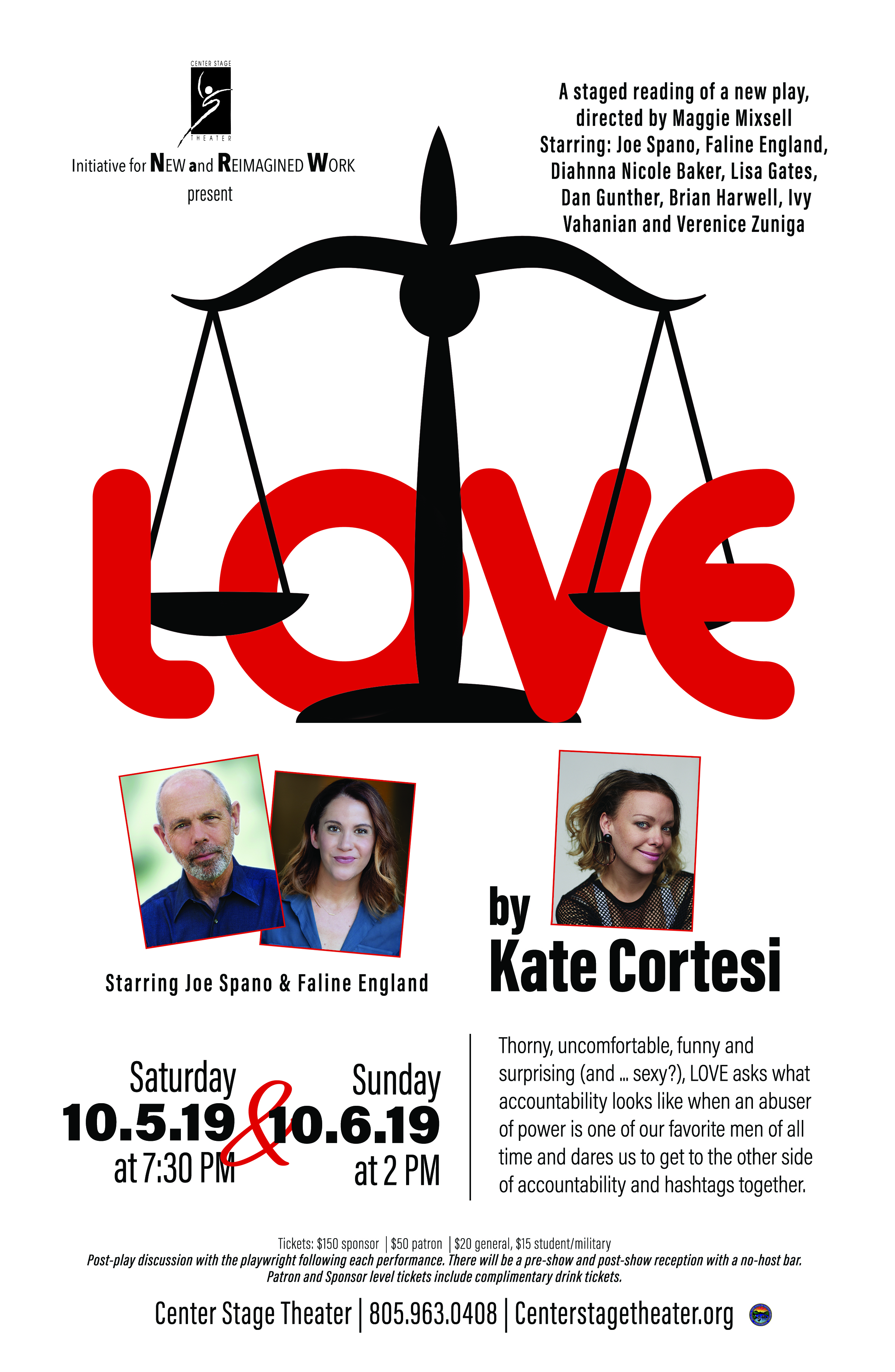 Straight from the 2019 Ojai Playwrights Conference comes Love, a play that faces the damaging fallout of sexual encounters in the workplace. By award-winning playwright Kate Cortesi, Love draws and redraws the unsteady lines of acceptable professional behavior, and searches the complicated grey area of power dynamics related to gender and consent. Written and performed in a time when hashtags like #metoo and #believewomen exemplify a changing social dynamic, Love dares to examine the uncertainties beyond the slogans. Both performances will be followed by a discussion of the play’s themes with the playwright, facilitated by a panel of local academics and social advocates.
