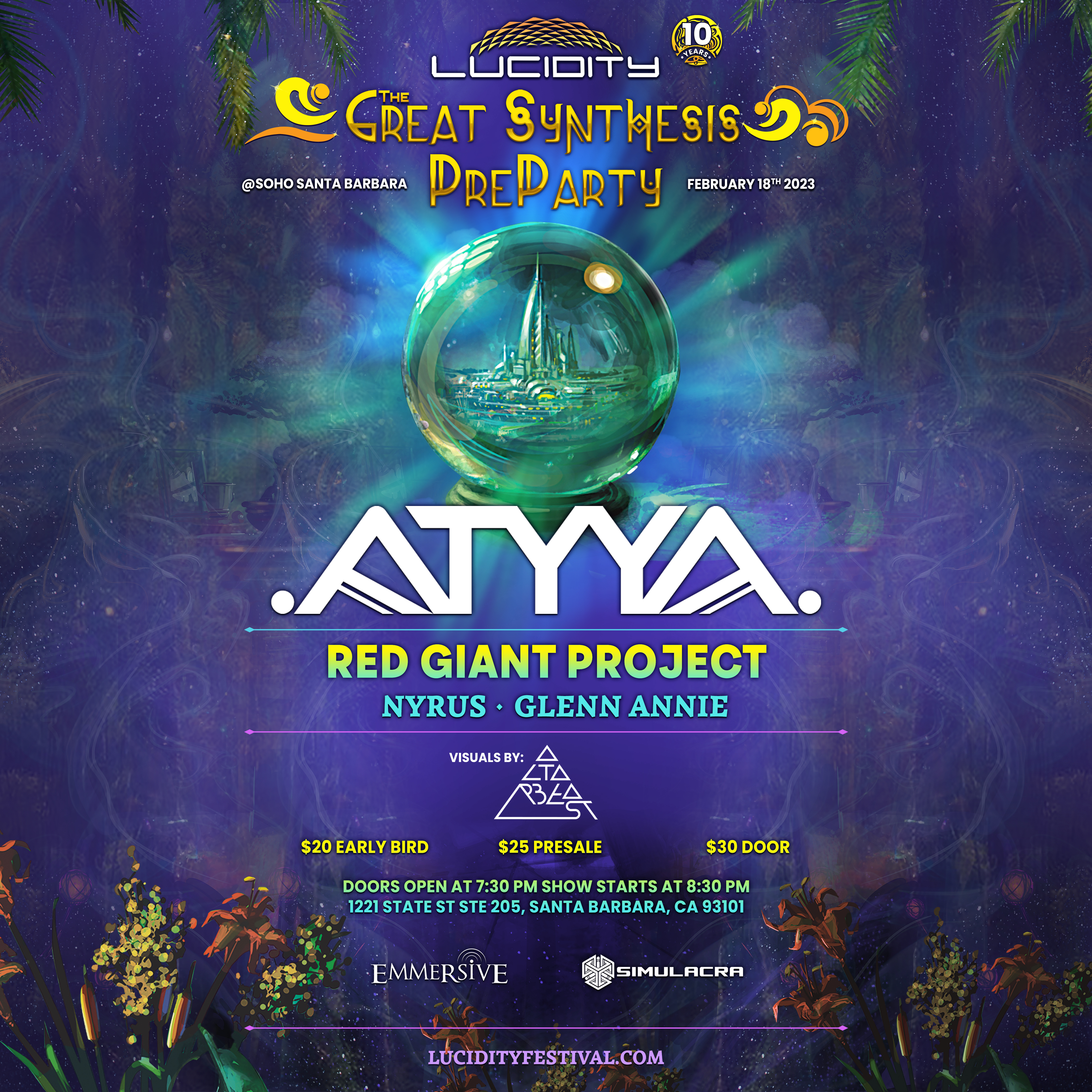 Join us for a classic gathering of friends and community and a night of spectacular music. This year’s preparty lineup features talented artists ATYYA, Red Giant Project, Nyrus, and Glenn Annie.
