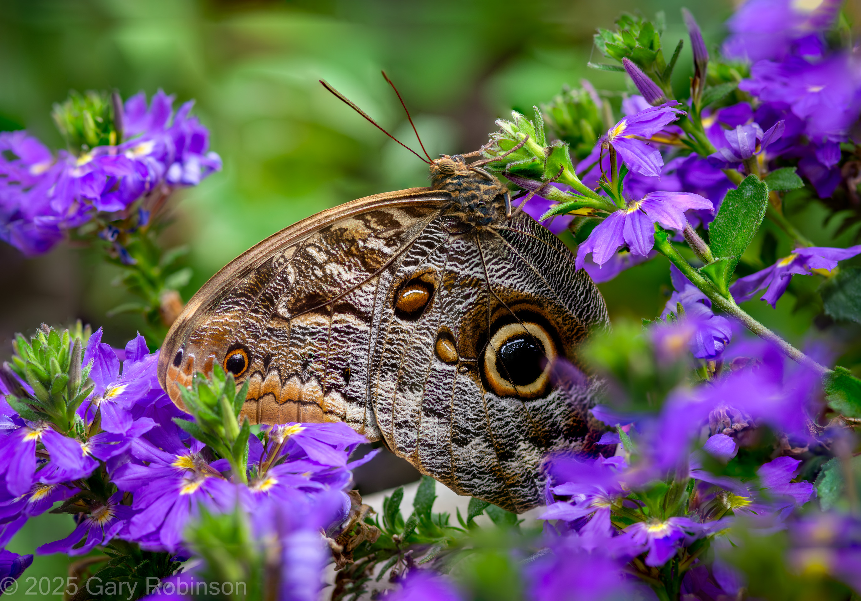 Giant Owl butterfly macrophoto © 2025 Gary Robinson