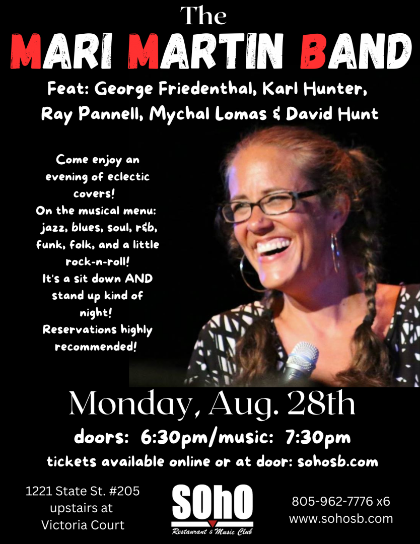 Mari was a staple of the Santa Barbara music scene for years and is so excited to be back at her musical home-away-from-home at SOhO!