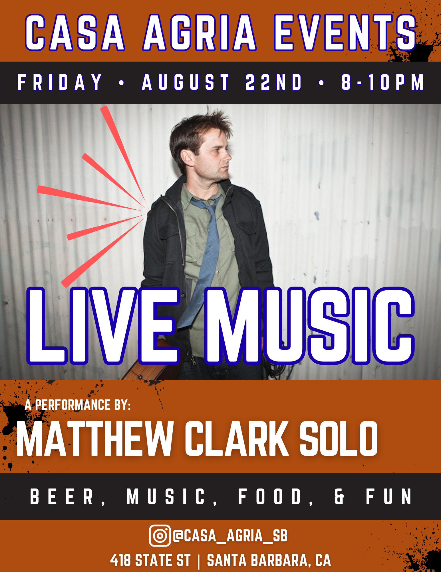 Kick Off Your Weekend with Matthew Clark LIVE! 🍻🎸 Join us this Friday, August 22nd, 8–10PM in our beer garden for a special solo performance by the one and only Matthew Clark! 🎶✨ Good vibes, cold beer, and killer tunes — the perfect way to start your weekend right! Don’t miss out on an unforgettable Friday night. See you there! 🍺🔥 #MatthewClarkLive #BeerGardenVibes #WeekendKickoff #CasaAgriaEvents