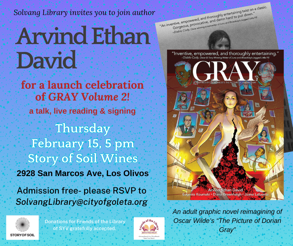 Solvang Library invites the public to meet local author Arvind Ethan David and to celebrate the launch of the second volume of his adult graphic novel Gray Thursday February 15 at Story of Soil Wines in Los Olivos, 2928 San Marcos Avenue.