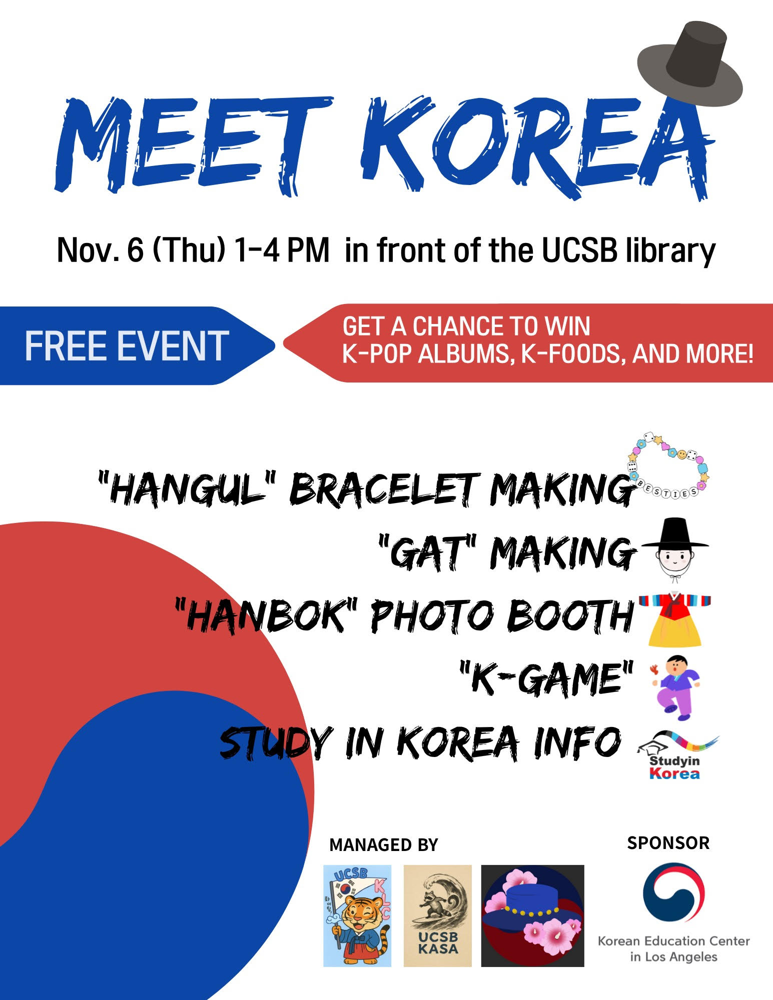 The event invites the UCSB and Santa Barbara communities to explore Korean language, culture, and study abroad opportunities through interactive booths and activities. Participants can experience traditional Korean attire (Hanbok), make bracelets with Korean alphabet beads, make cultural crafts like the “gat” hat, and play traditional games with prizes. Representatives will also provide information on studying at Korean universities.
