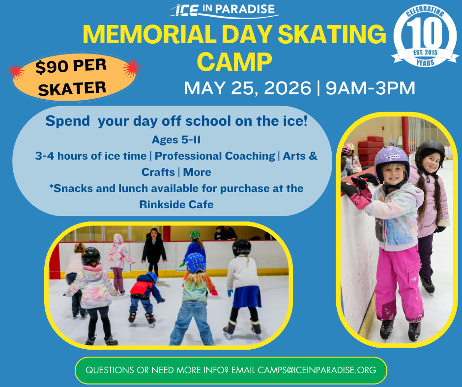 Memorial Day Skating Camp will be held May 25 from 9:00am–3:00pm for ages 5–11.