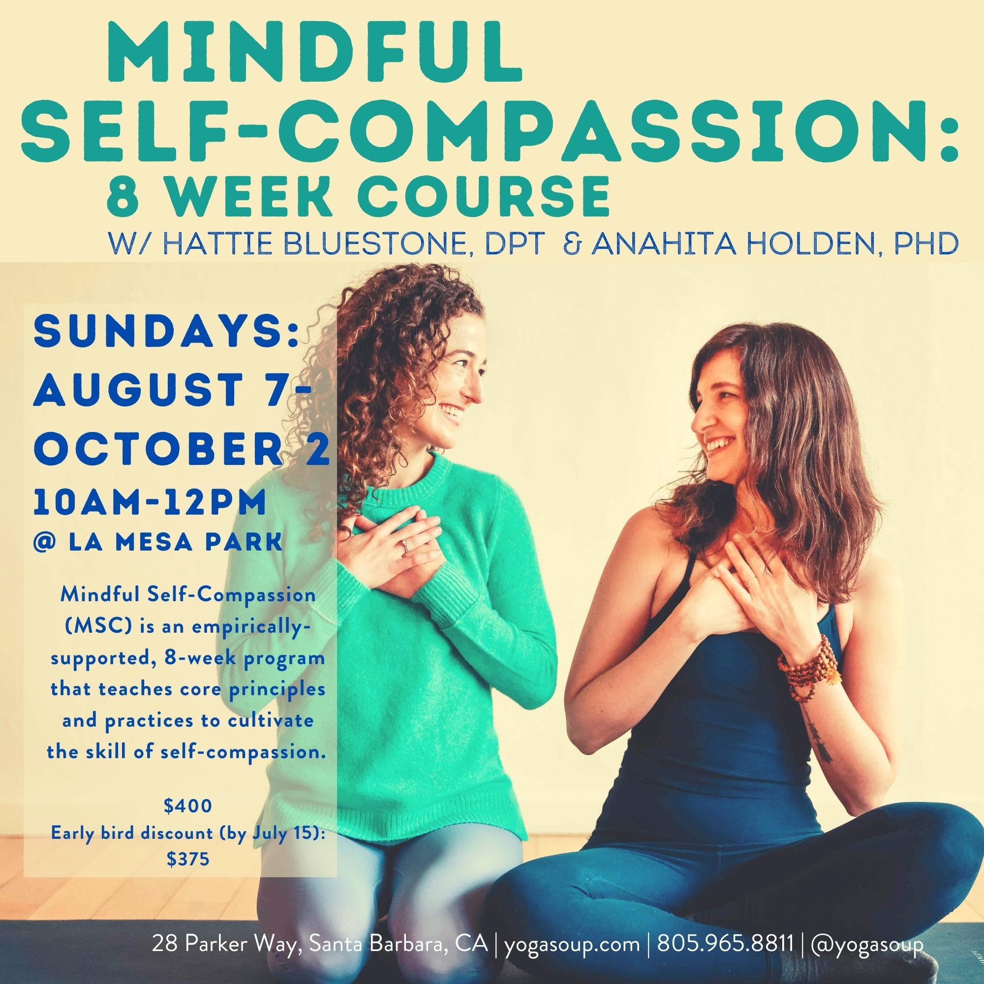 We are thrilled to be offering one last round of the Mindful Self-Compassion (MSC) course for the next stretch of time, through Yoga Soup! This will be an intimate group of connection and practice of self-compassion surrounded by the beautiful ocean view setting of La Mesa Park. Here is the info to be shared with all interested parties: