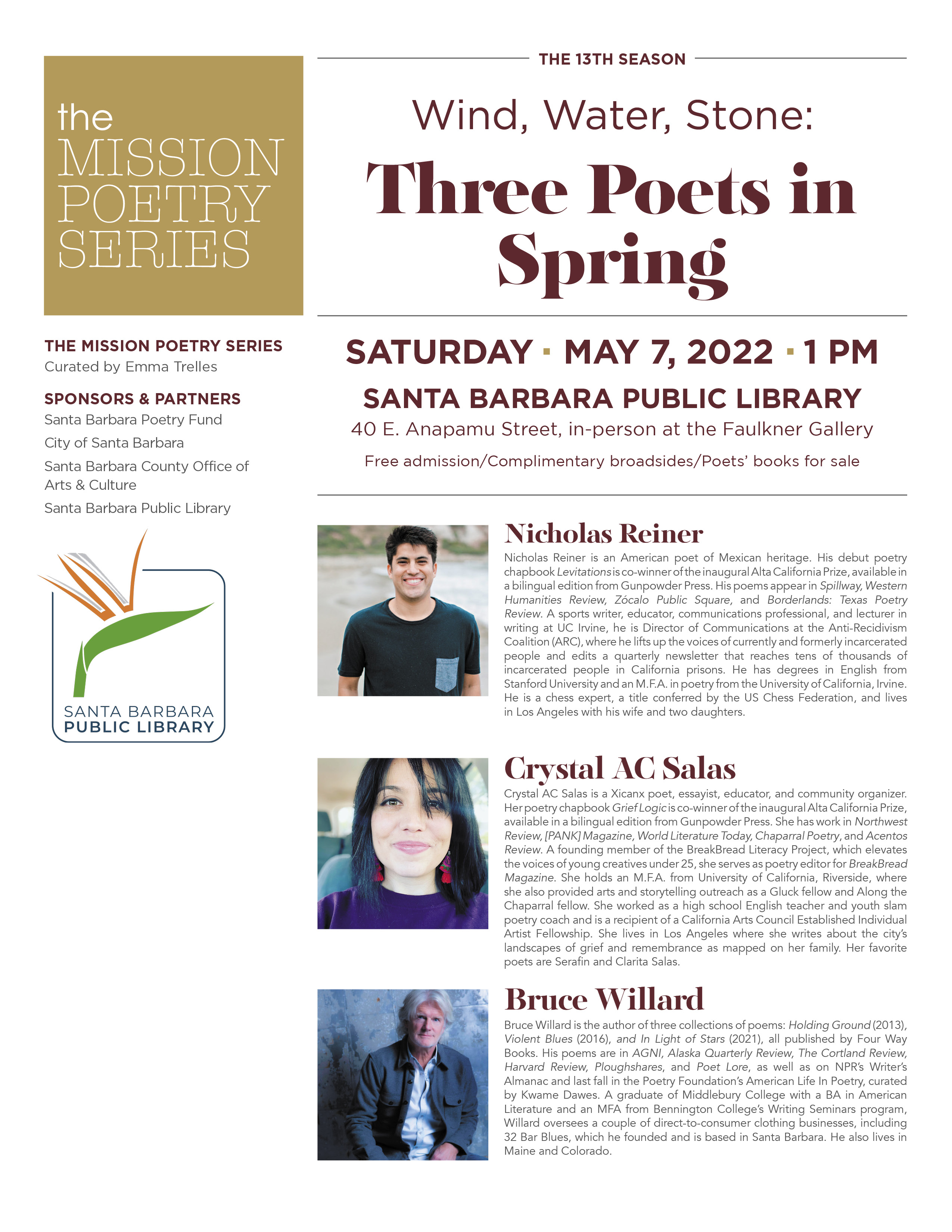 Wind, Water, Stone: Three Poets in Spring features three award-winning authors: Nicholas Reiner, Crystal AC Salas, and Bruce Willard. The title of the event is taken from the poem “Viento, agua, piedra,” by the Mexican poet and essayist Octavio Paz. This in-person reading is held at the Santa Barbara Public Library in the Faulkner Gallery and is free and open to the public. The event offers complimentary broadsides, poets’ books for sale, and the chance to meet and chat with our featured poets.