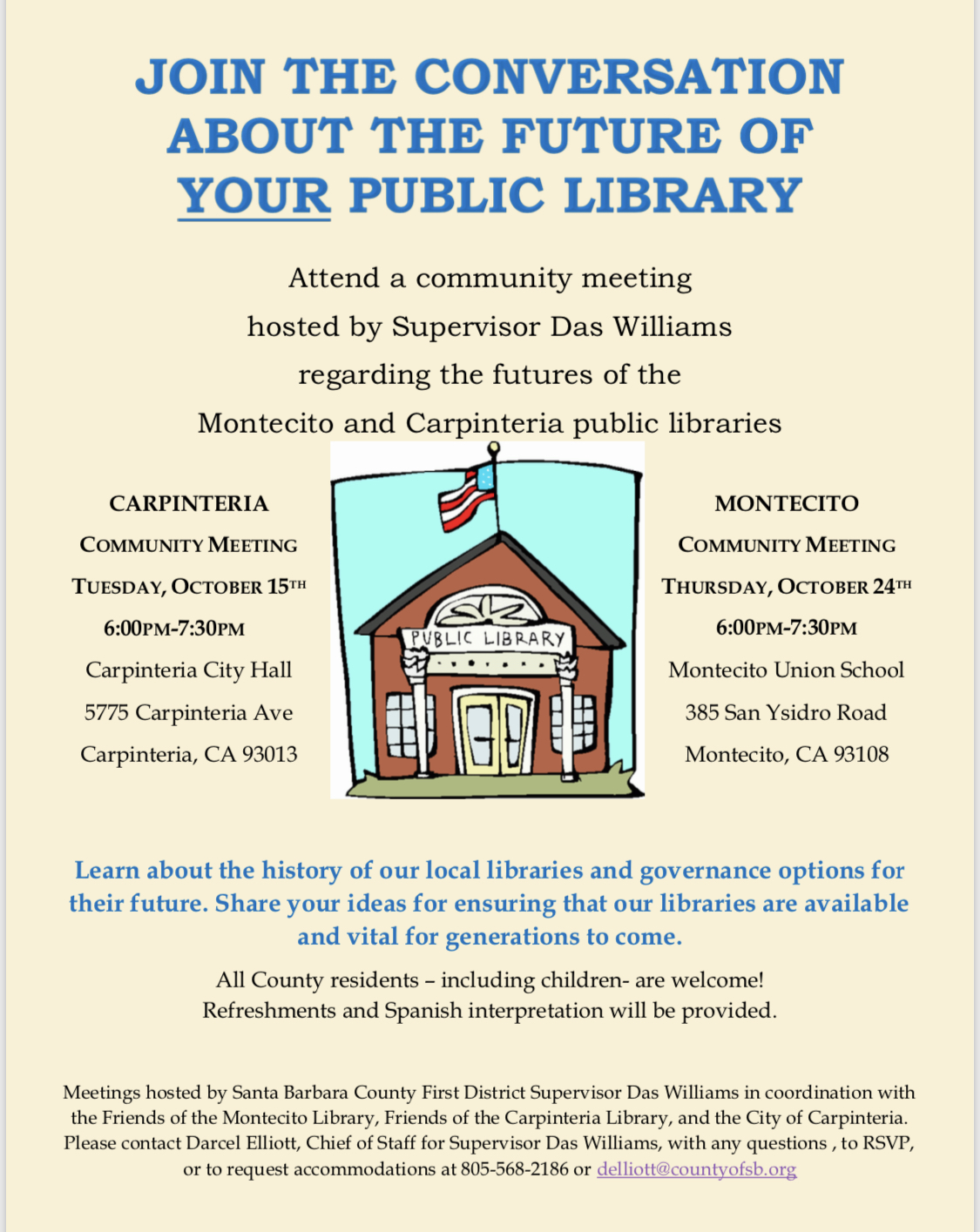 Meetings hosted by Santa Barbara County First District Supervisor Das Williams in coordination with the Friends of the Montecito Library, Friends of the Carpinteria Library, and the City of Carpinteria. Please contact Darcel Elliott, Chief of Staff for Supervisor Das Williams, with any questions , to RSVP, or to request accommodations at 805-568-2186 or delliott@countyofsb.org
