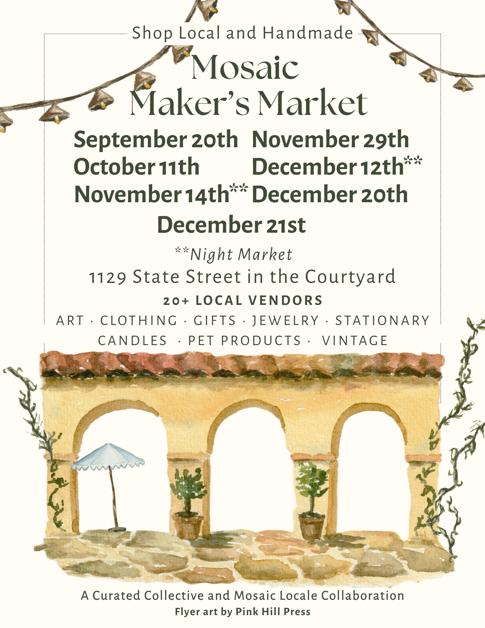 Join us for the Mosaic Makers Market, a monthly outdoor marketplace in the heart of downtown Santa Barbara. Each market brings together more than 20 local makers offering handmade art, jewelry, clothing, candles, baked goods, vintage finds, and unique gifts.