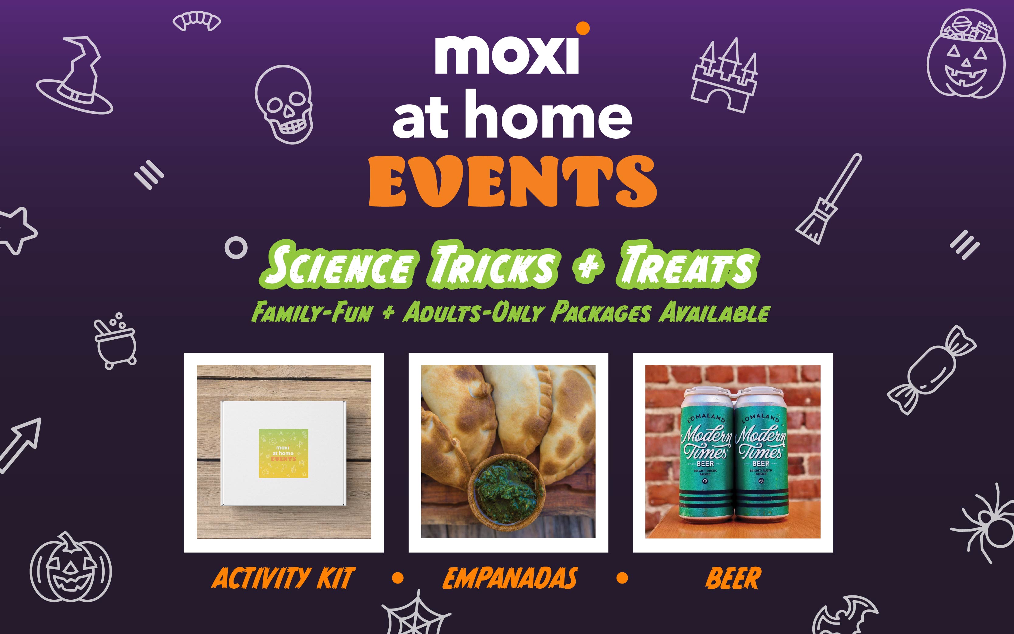 Includes Buena Onda ready-to-heat empanada meal, mixed 4-pack of Modern Times brew, and a MOXI-made activity kit filled with everything you need for a day or night of spooky, silly, seasonal science-y fun. Adults-Only and Family-Fun options available.