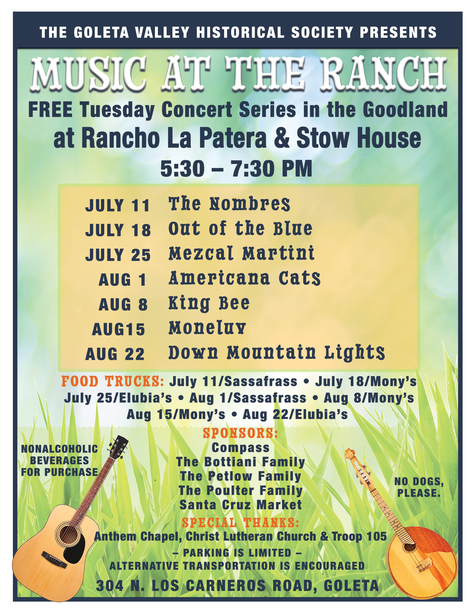 Join the Goleta Valley Historical Society Tuesdays from 5:30pm-7:30pm for an evening of free live music on the grounds of Rancho La Patera and Stow House.