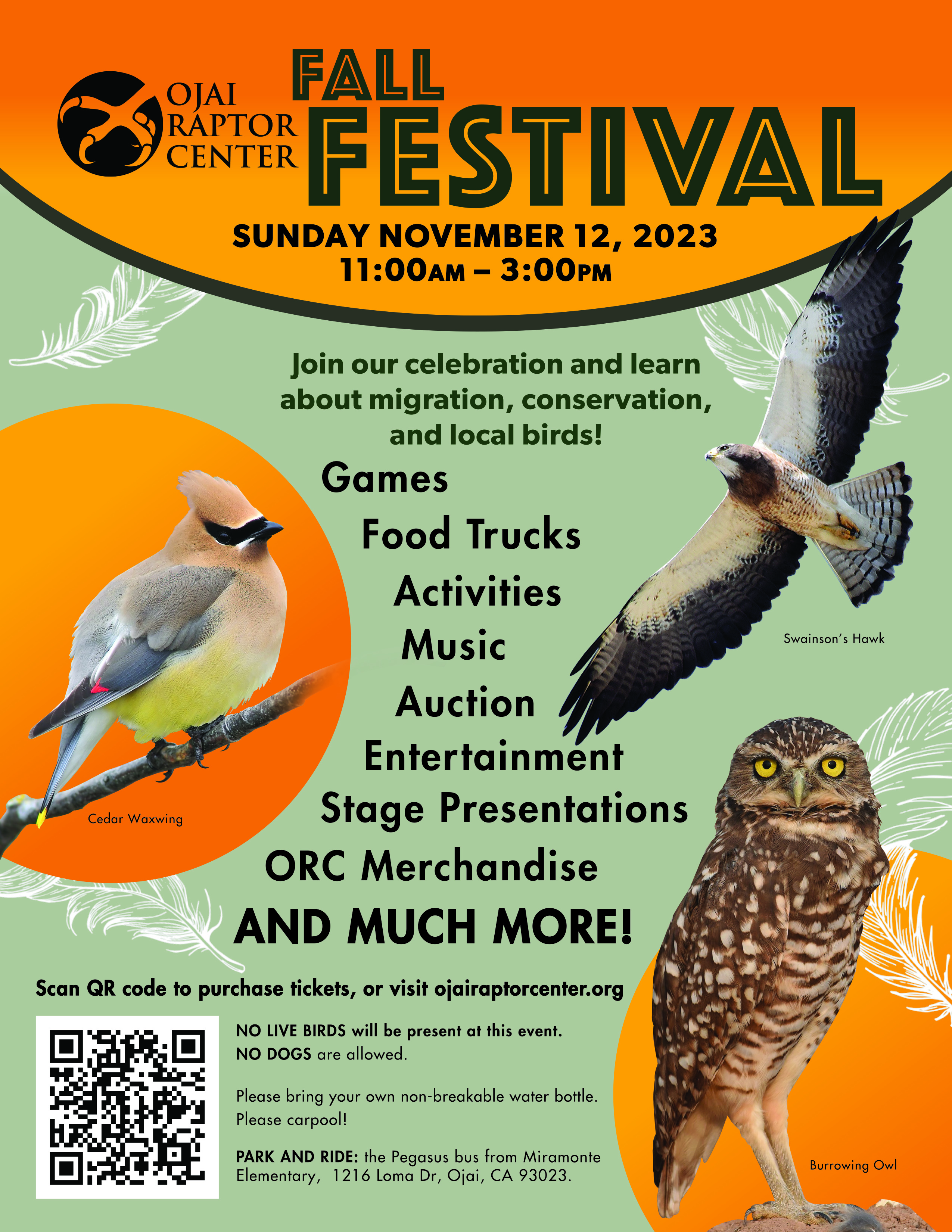 Ojai Raptor Center Fall Festival tickets are available for pre-sale only. To purchase tickets: Scan QR code, Click here , or Visit the ORC Events page: www.ojairaptorcenter.org/orc-events