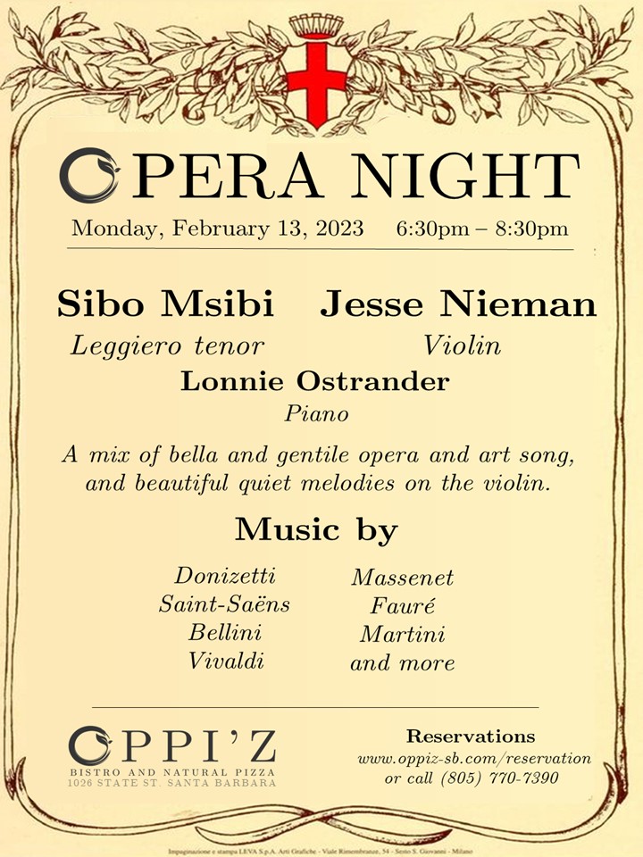 Sibo Msibi (Leggiero tenor) and Jesse Nieman (Violin) will perform accompanied by Lonnie Ostrander (Piano)