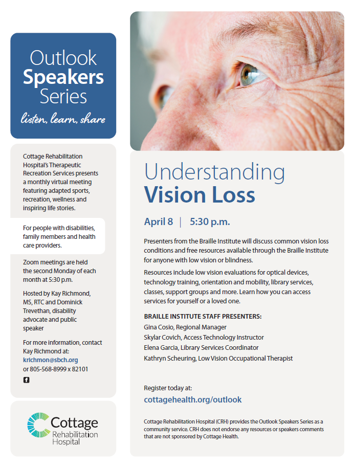 Cottage Rehabilitation Hospital (CRH) provides the Outlook Speakers Series as a community service. CRH does not endorse any resources or speakers comments that are not sponsored by Cottage Health.