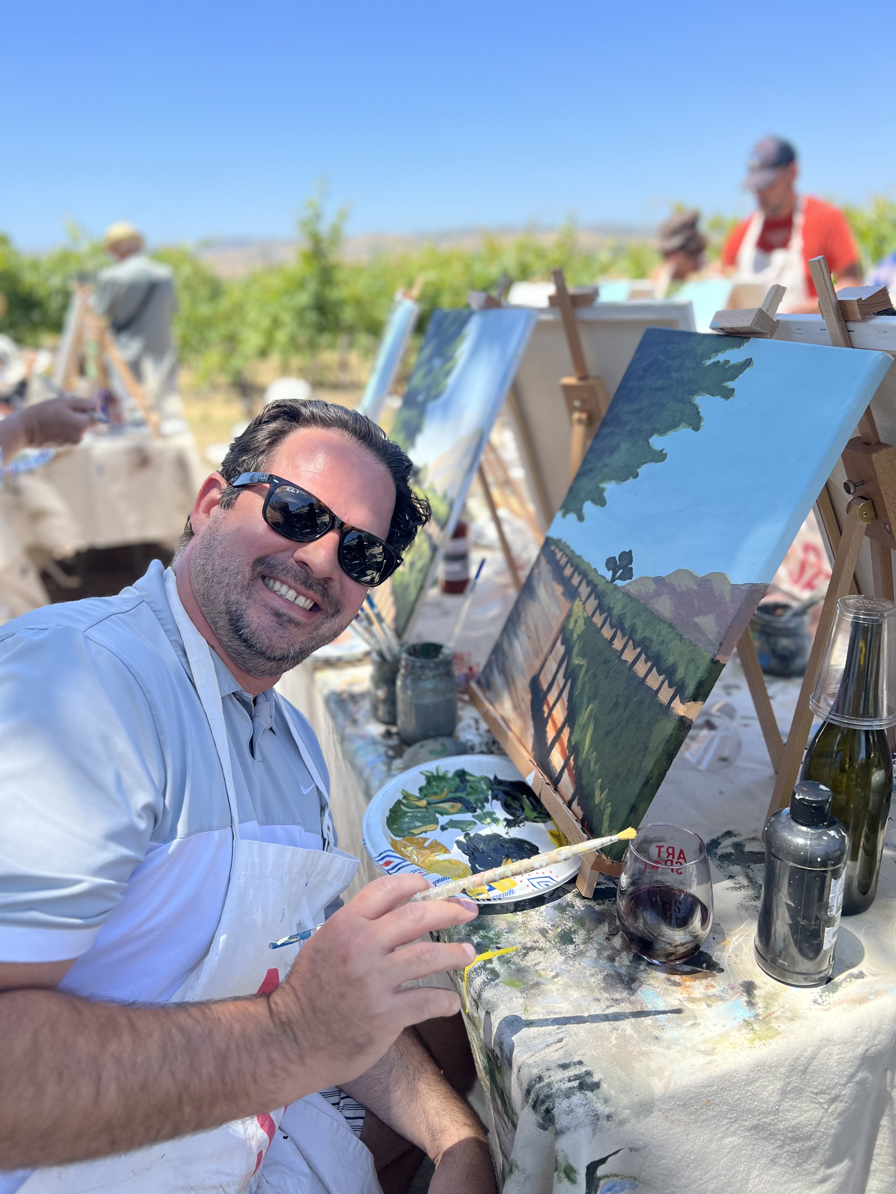 Are you looking for something unique to do in Santa Barbara County Wine Country? Why not join us at the picturesque Vega Vineyard and Farm in Buellton to grab a glass of wine and a paintbrush?! You’ll spend the afternoon sipping delicious wine and capturing the beauty of the landscape on canvas.Not just another paint and sip class, this is a full-sensory experience. Our painting in the vineyard classes provide a beautiful, stress-free environment that will both inspire your creative spirit and indulge the wine-lover in you. Don’t consider yourself an artist just yet? Don’t worry. Our trained artist will walk you through the entire painting process step-by-step. No previous painting experience necessary. You’ll be amazed at what you can create in just a few hours- even if you’ve never picked up a paintbrush in your life!