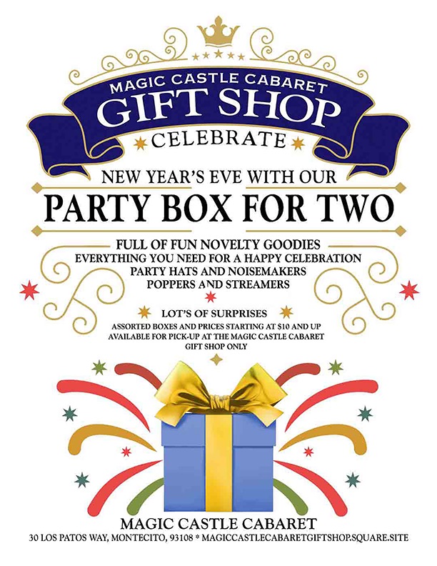 Celebrate New Year’s Eve with the Magic Castle Cabaret Party Box for Two. Full of novelty goodies with everything you need — Party Hats, Noisemakers, Poppers and Streamers! And more surprises!