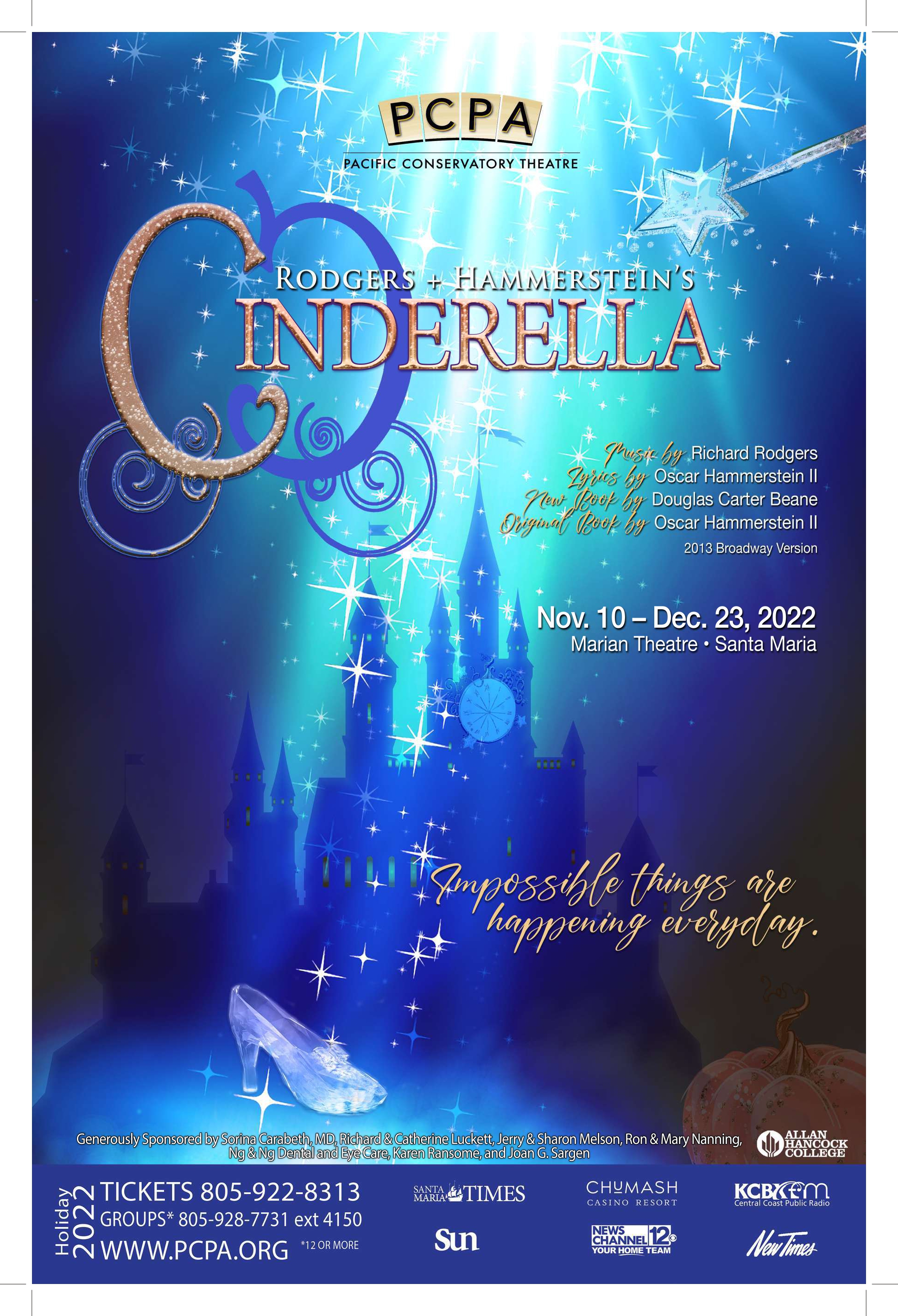 Last seen at PCPA in 2015 and back by popular demand for the whole family: the Broadway adaption of Rodgers + Hammerstein’s Cinderella. This fresh, contemporary take on the classic musical is full of new surprises, familiar friends, and Rodgers and Hammerstein’s unforgettable music.