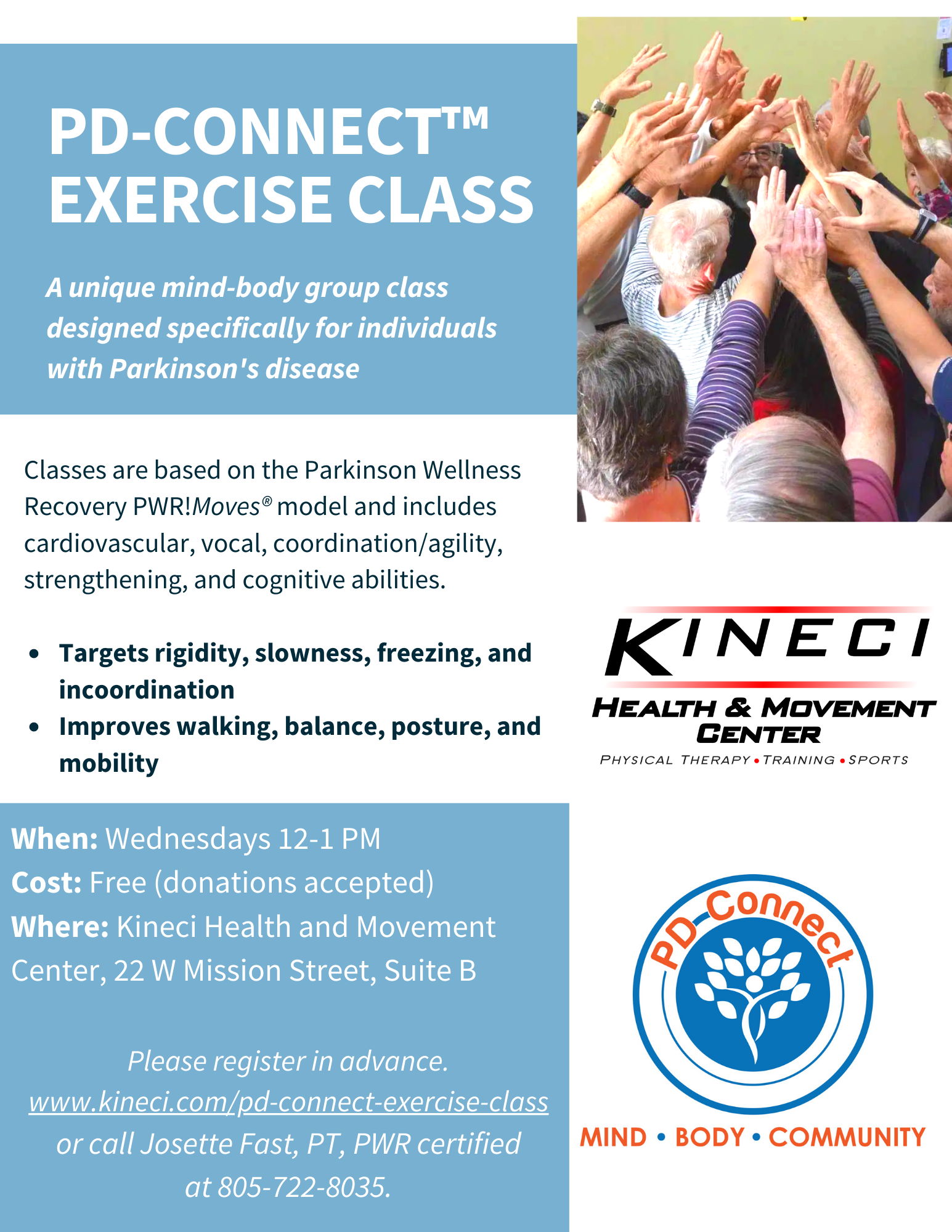 Classes are based on the Parkinson Wellness Recovery PWR!Moves® model and includes cardiovascular, coordination/agility,
