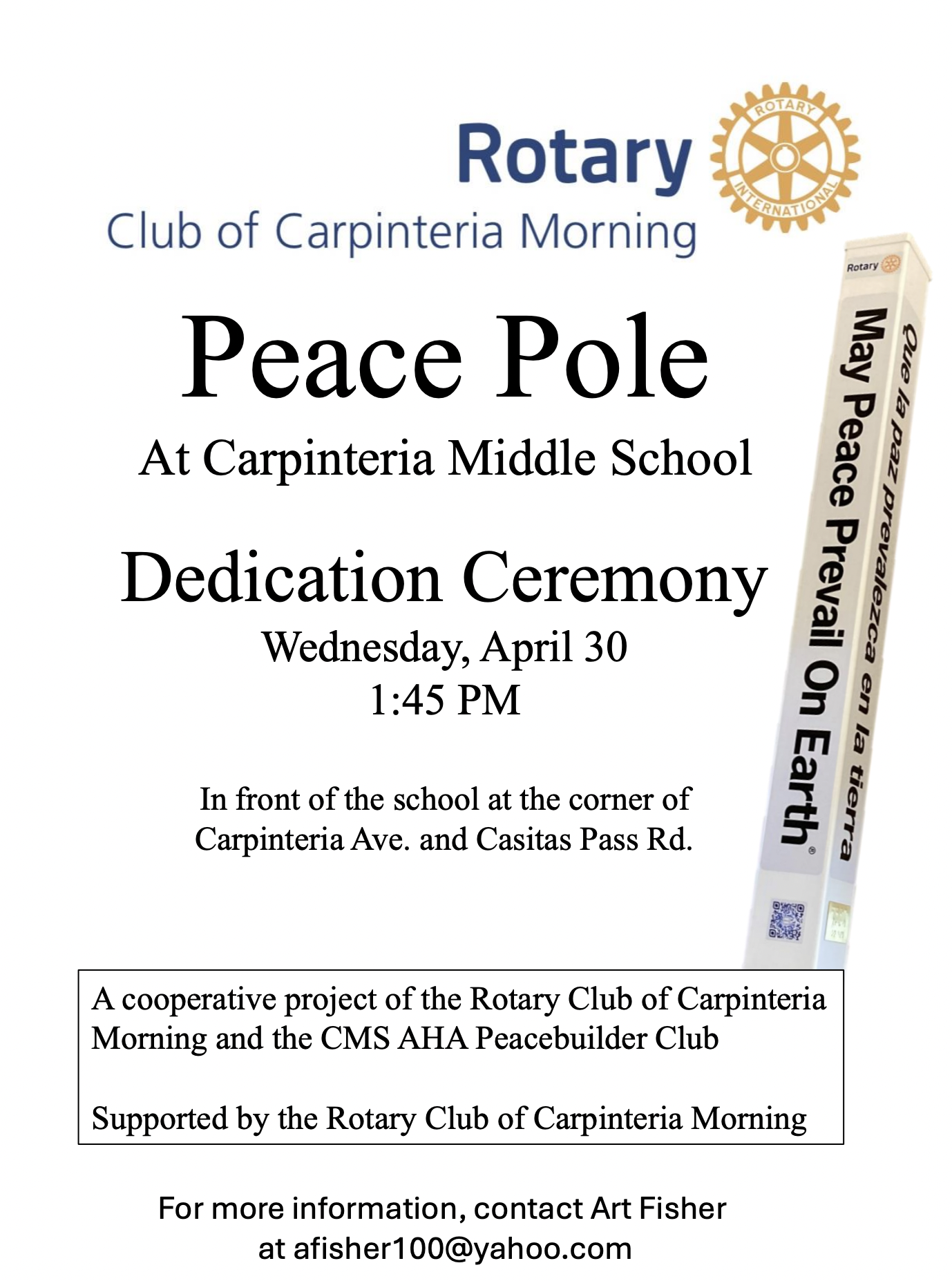 The Rotary Club of Carpinteria Morning, in cooperation with Carpinteria Middle School (CMS), is installing a Peace Pole in front of CMS, at the corner of Carpinteria Avenue and Casitas Pass Road. A dedication ceremony will take place on Wednesday, April 30 at 1:45 PM. This event will involve Rotary members from across the region, CMS staff and teachers, students, and parents. We expect 40 to 50 people will attend. The ceremony will last approximately 30 minutes.