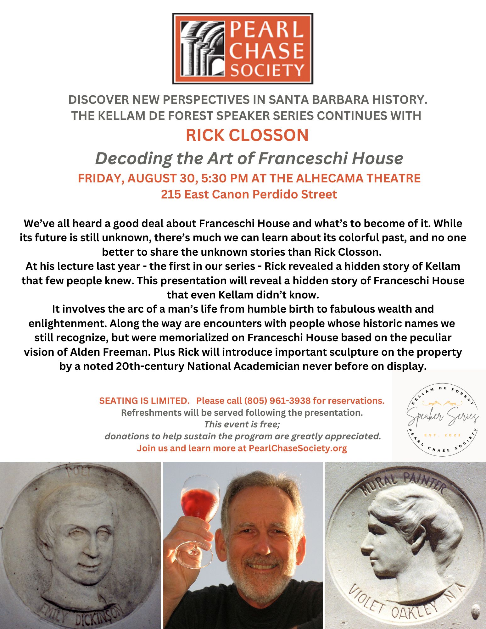 Long time Pearl Chase Society member, Rick Closson, will offer history and context for many of Alden Freeman’s mysterious medallions, plus unveil important sculpture on the property by a noted 20th century National Academician never before on display.