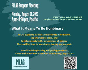 “What it Means to be Nonbinary” – Join PFLAG as they support all of us with accurate information, opportunities to learn and to listen deeply to the experiences of others. There is always time for questions, sharing and support. We will also get ready for the Santa Barbara Pride Celebration on Saturday, August 26. This is a Zoom meeting. Please pre-register by emailing pflagsantabarbara@gmail.com