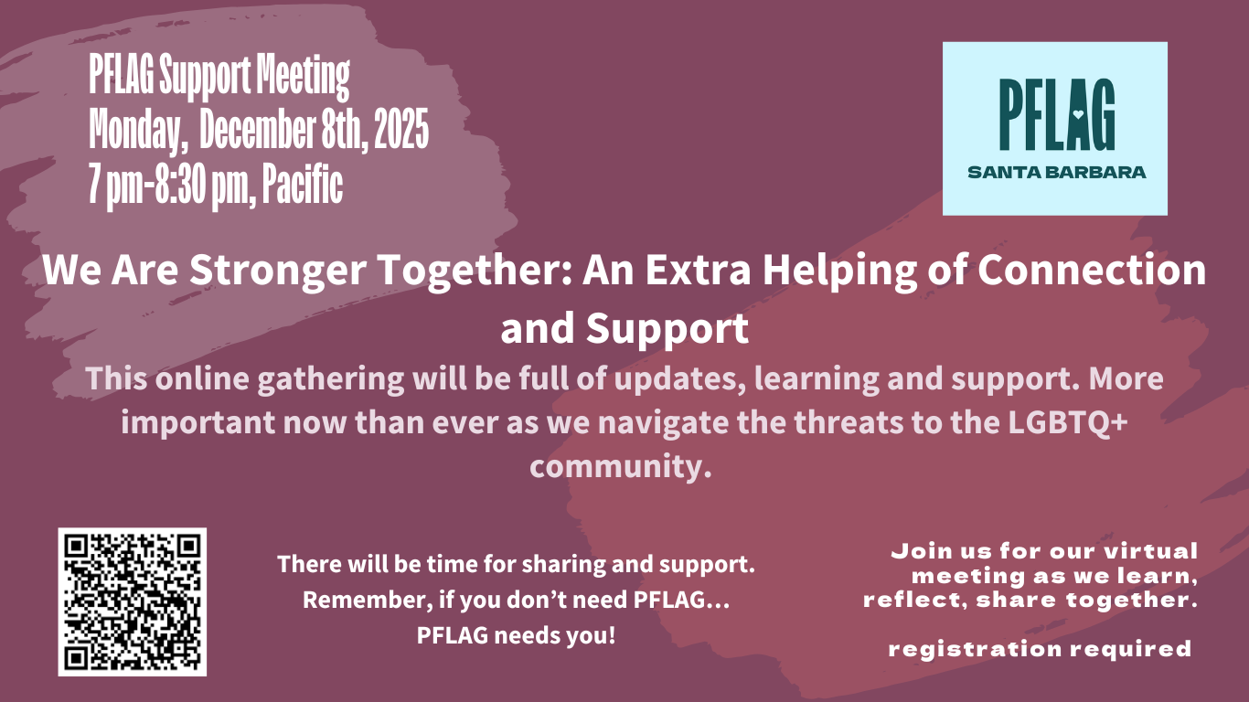 Please join us for our December PFLAG meeting “We Are Stronger Together: An Extra Helping of Connection and Support”. This online gathering will be full of updates, learning and support. This is a Zoom meeting and pre-registration is required by emailing pflagsantabarbara@gmail.com.