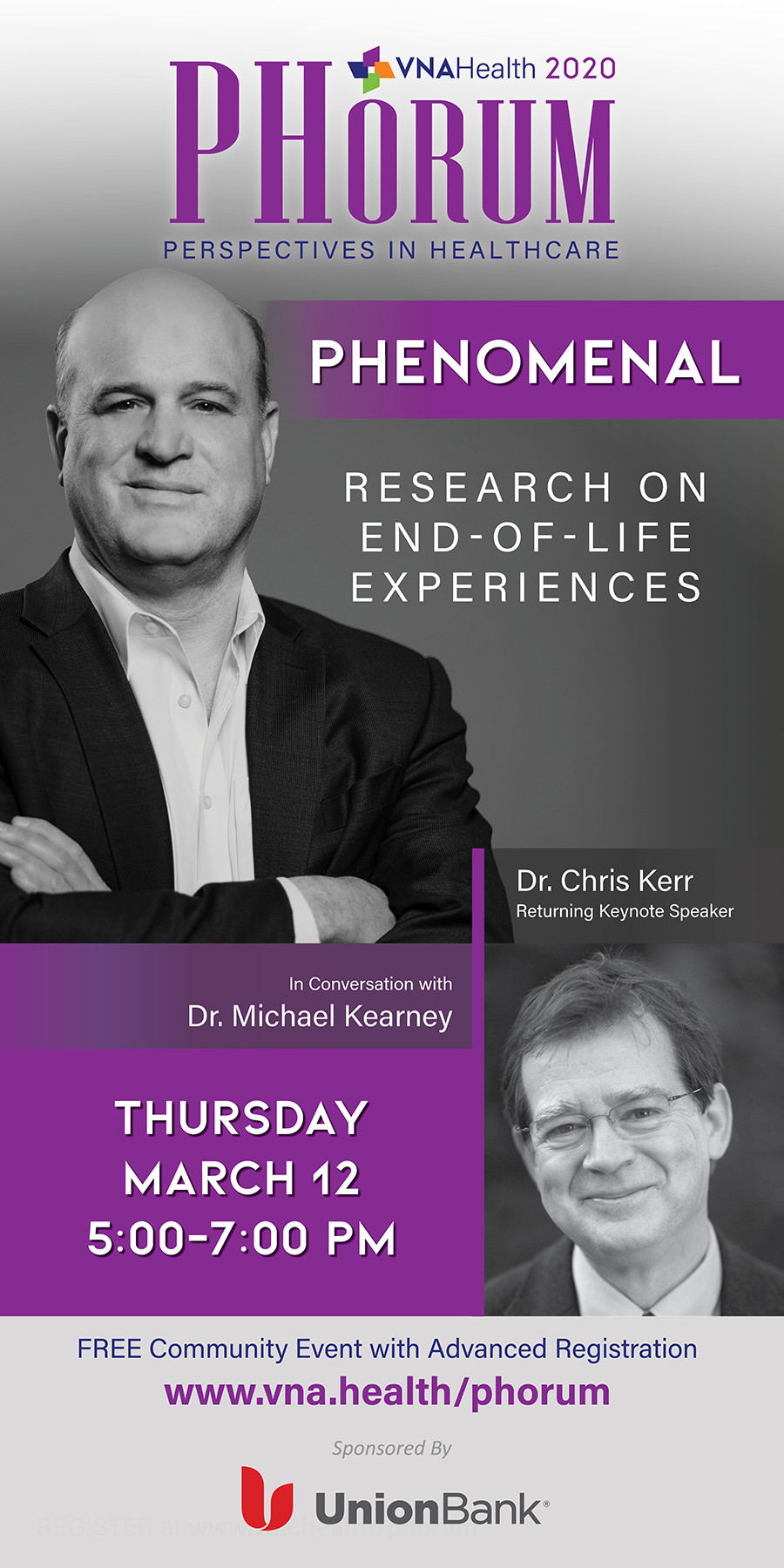 VNA Health (formerly known as Visiting Nurse & Hospice Care) presents its 7th Annual PHorum with the return of Dr. Chris Kerr, neurobiologist and CEO & Chief Medical Officer for the Center for Hospice and Palliative Care in Buffalo, New York. Dr. Kerr will discuss his latest findings: PHENOMENAL Research on End-of-life Experiences