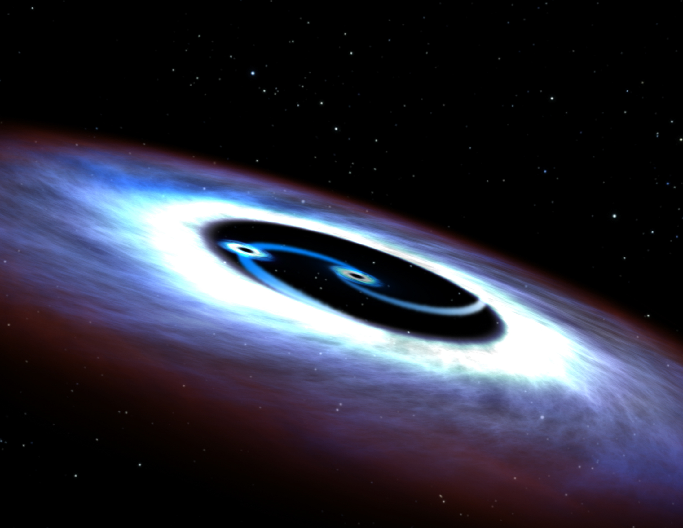 Artist’s image using Hubble Space Telescope data from a binary black hole at the center of the nearest quasar by NASA, ESA, and G. Bacon (STScl)