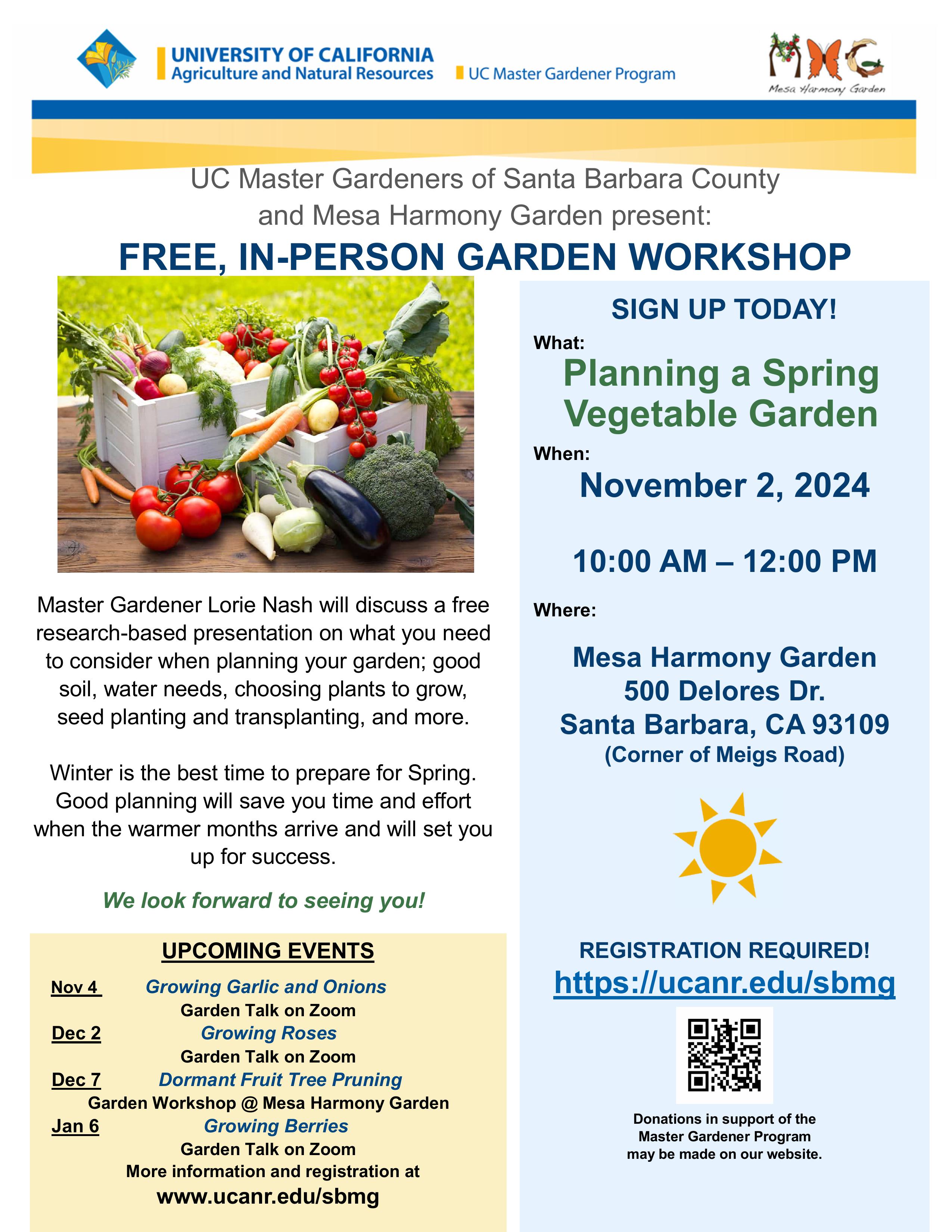 UC Master Gardeners of Santa Barbara County and Mesa Harmony Garden are offering a Free, In-Person Workshop on Planning a Spring Vegetable Garden.