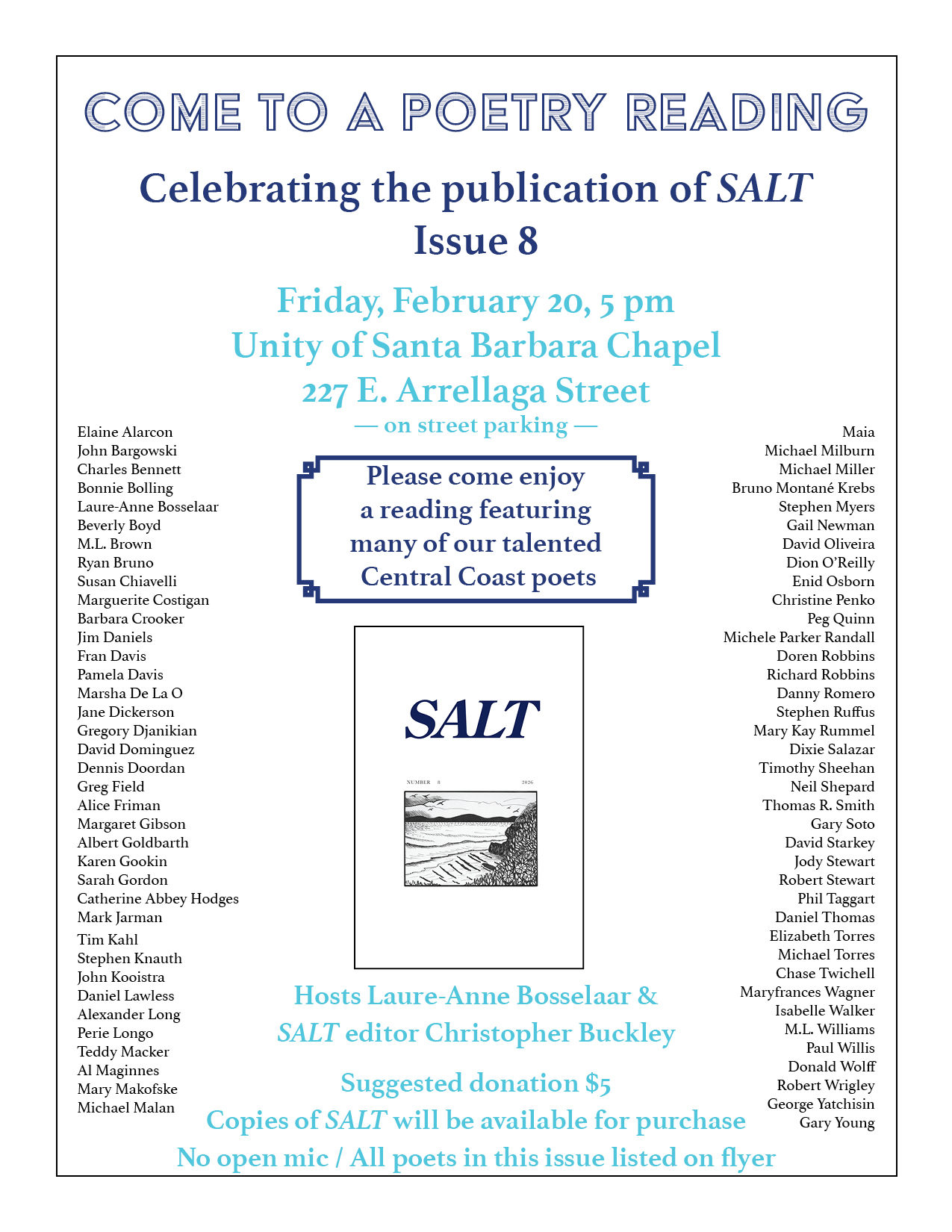 The event, hosted by Laure-Anne Bosselaar and SALT editor Christopher Buckley, will be on Friday, February 20 at 5 pm at the Unity of SB Chapel, 227 E. Arrellaga St., Santa Barbara.
