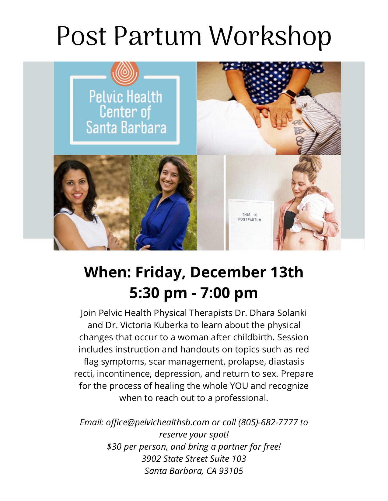 Join Pelvic Health Physical Therapists Dr. Dhara Solanki and Dr. Victoria Kuberka to learn about the physical changes that occur to a woman after childbirth. Session includes instruction and handouts on topics such as red flag symptoms, scar management, prolapse, diastasis recti, incontinence, depression, and return to sex. Prepare for the process of healing the whole YOU and recognize when to reach out to a professional.