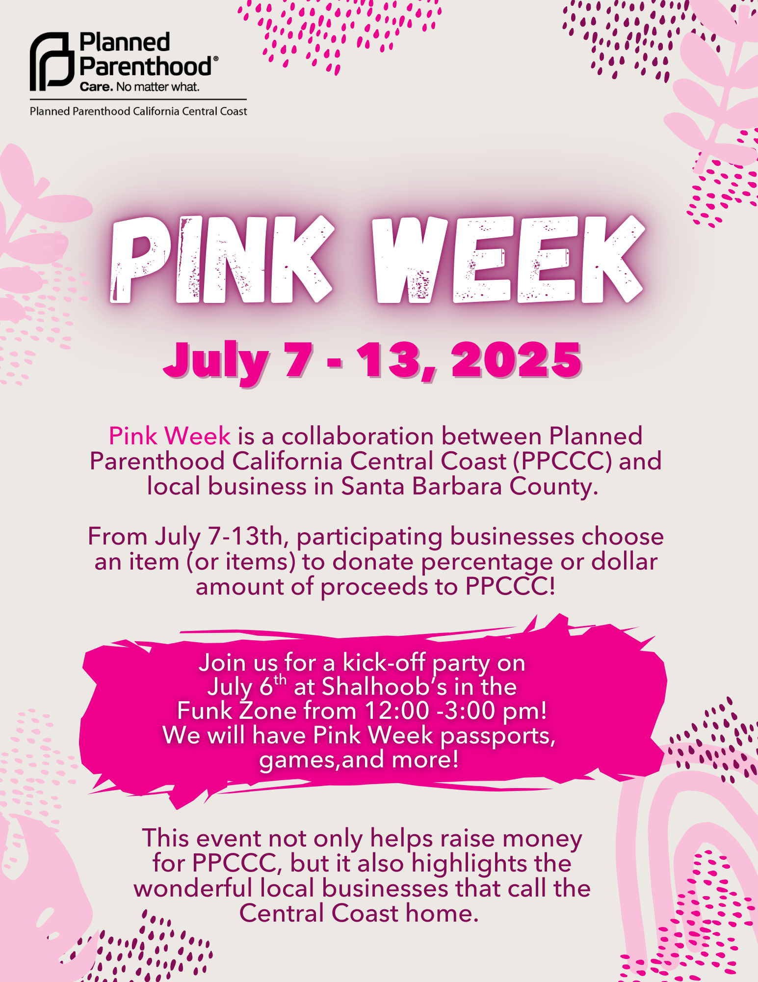 Each year, Planned Parenthood California Central Coast’s Young Advocates host a week-long fundraiser known as Pink Week. During Pink Week, local businesses donate a portion of the proceeds from a pink item of their choosing to Planned Parenthood. Businesses can choose the percentage of proceeds they would like to donate, as well as the dates they would like to participate in Pink Week.