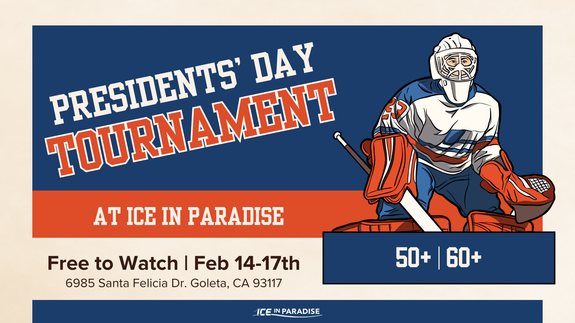 Ice in Paradise will host its Annual Adult Presidents’ Day Hockey Tournament starting Friday, Feburary 14, 2024 and ending Sunday, February 16, 2025.