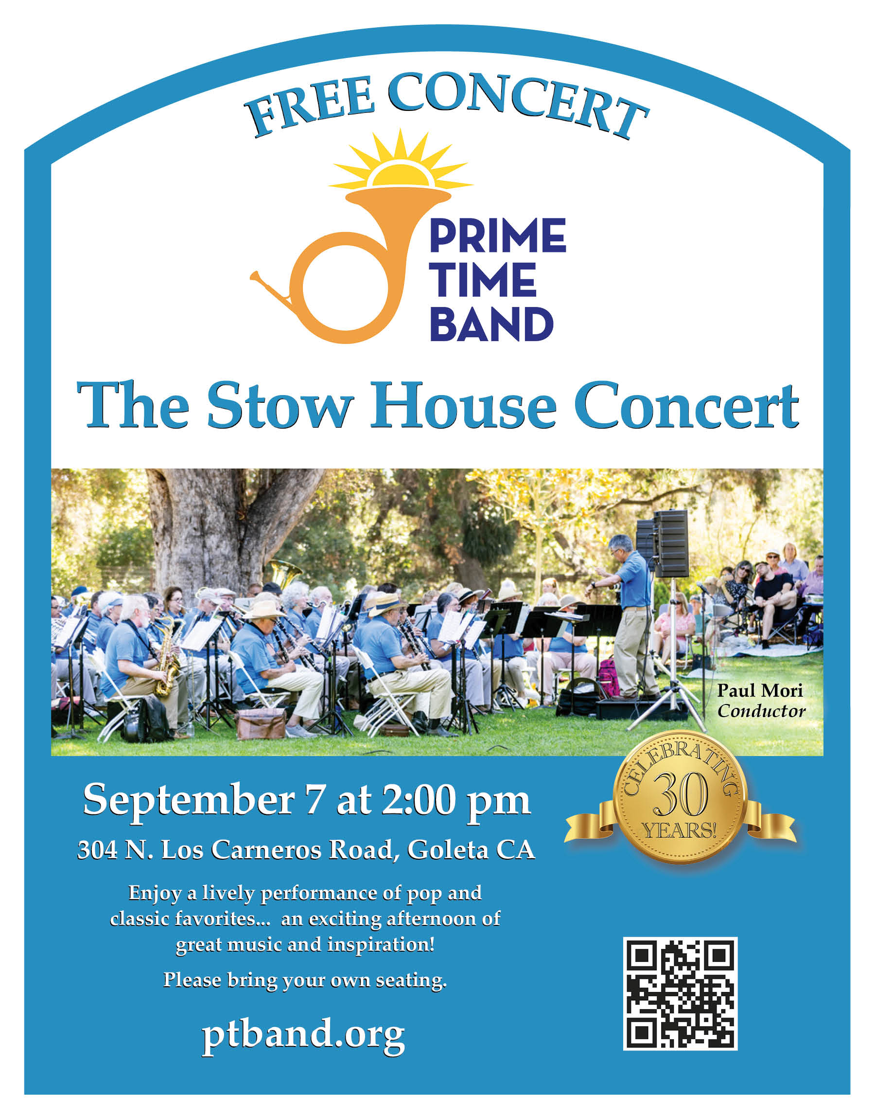 Prime Time Band presents a FREE Sunday afternoon concert at The Stow House on September 7th at 2:00 pm. This long-standing tradition began with the first Prime Time Band concert performance at The Stow House in 1998. Under the direction of Dr. Paul Mori, the band will perform a variety of pop, classics, show tunes and marches. We invite you to sing-along, or just sit back, relax and enjoy the performance.