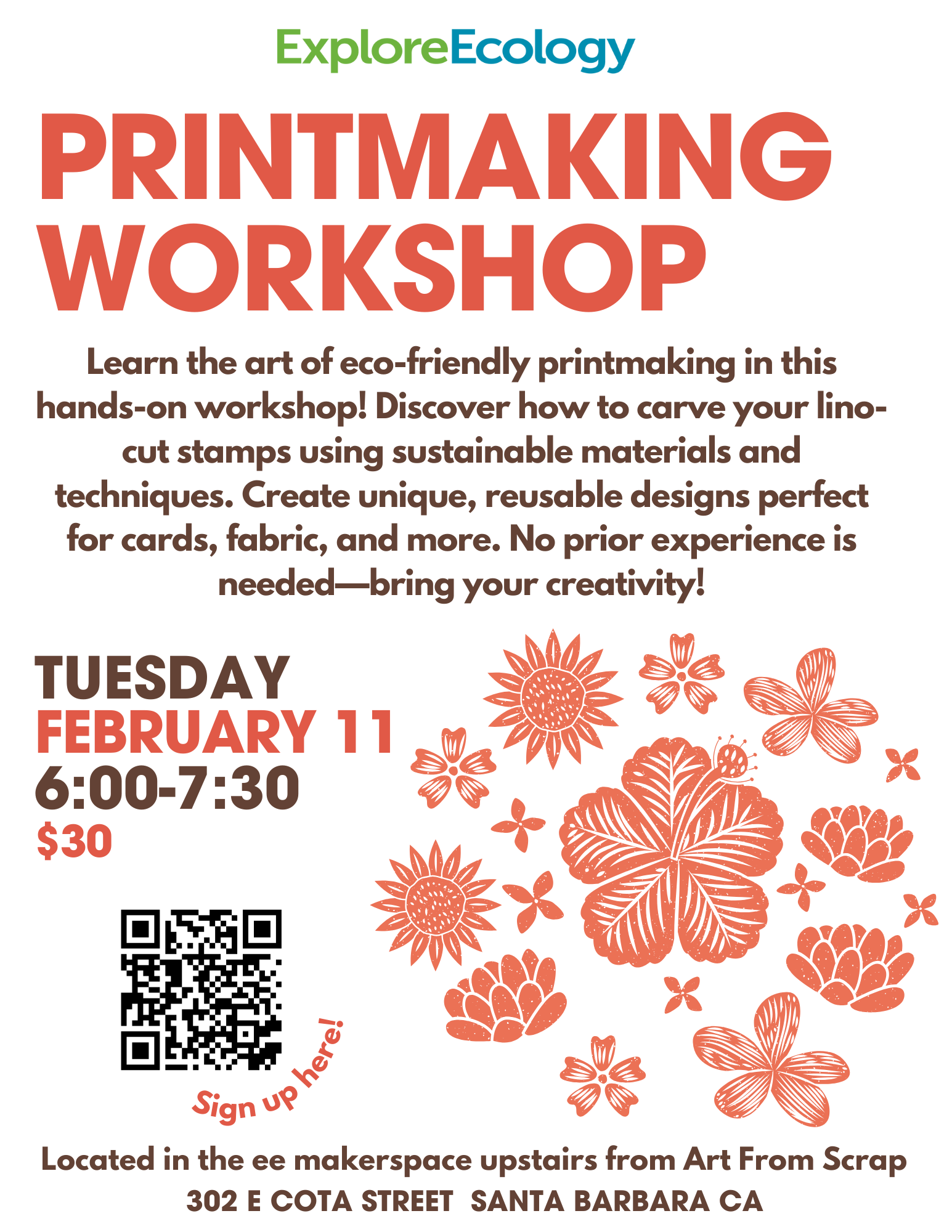 Learn the art of eco-friendly printmaking with EE Makerspace Coordinator Madison Connaughton on Sunday, February 11th, from 6:00 pm to 7:30 pm! In this hands-on workshop, you’ll carve your own linocut stamps using sustainable materials and techniques. Design unique, reusable creations perfect for cards, fabric, and more. No prior experience is needed—just bring your imagination!