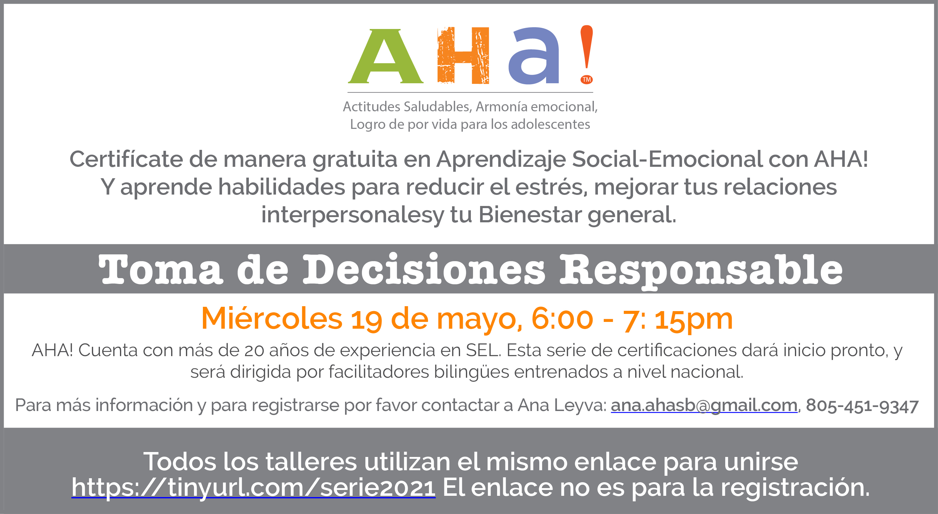 AHA! Cuenta con más de 20 años de experiencia educando jóvenes y adultos en Competencias Socio-emocionales. La serie de Programas Gratuitos que quedan son: