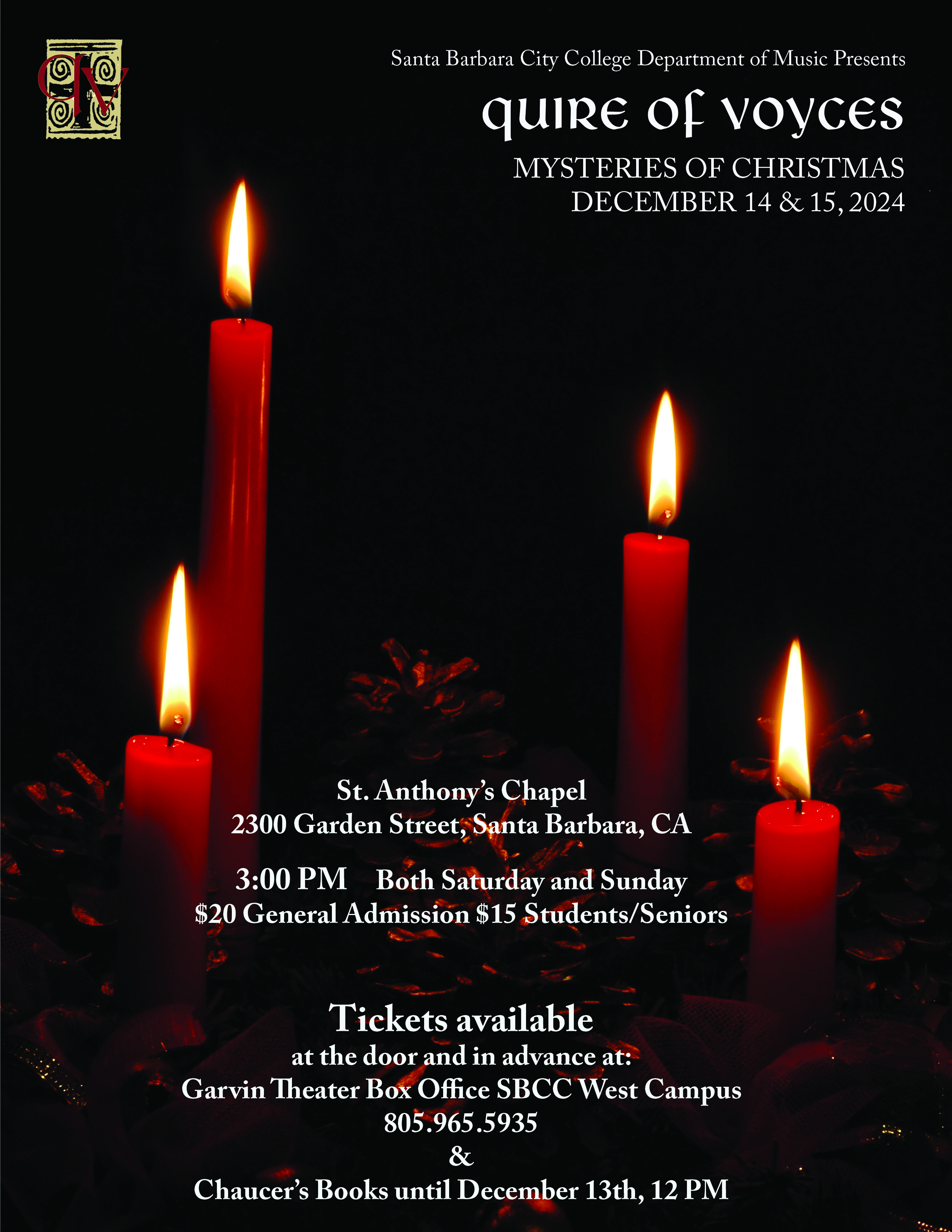 The Santa Barbara Quire of Voyces will perform Mysteries of Christmas on Saturday December 14 and Sunday December 15 at 3pm, at the St. Anthony’s chapel and directed by the talented Nathan Kreitzer. Immerse yourself in the enchanting world of sacred a cappella music as we convey a message of peace, love, and joy to our cherished Santa Barbara community. Tickets available now at the Garvin theater Box Office SBCC West Campus, 805.965.5965 and at Chaucer’s Books until Friday December 13th at noon.