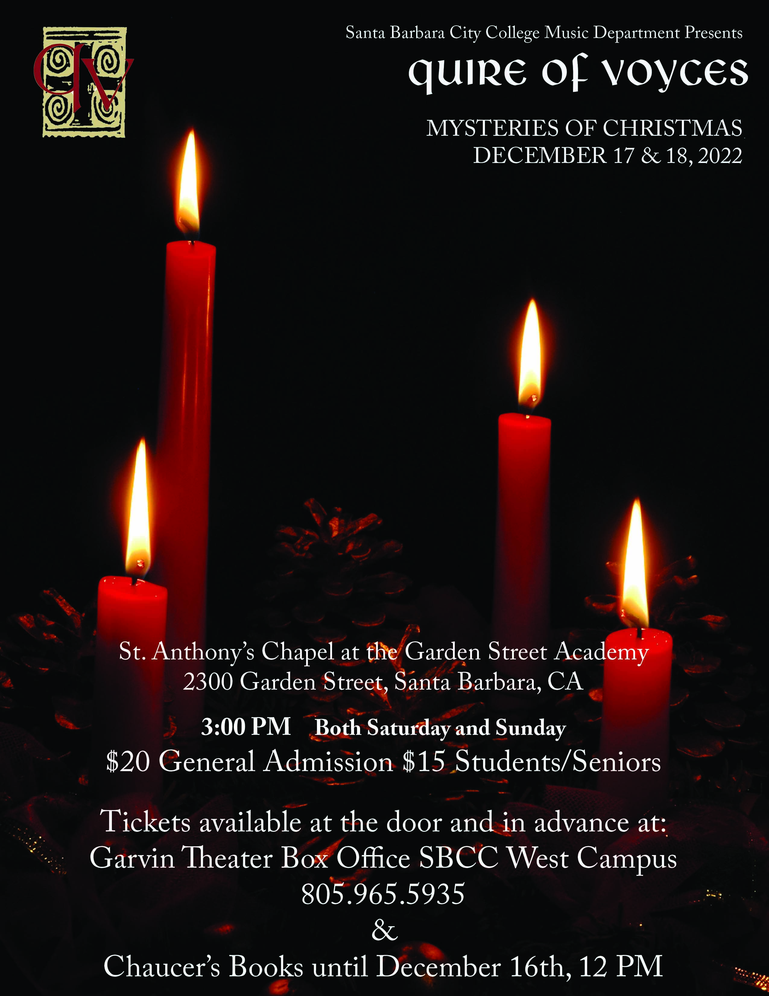 Santa Barbara’s Quire of Voyces’ 2022 “Mysteries of Christmas” concert is coming this December 17th and 18th at 3pm both days in resonant St Anthony’s Chapel on Garden St.