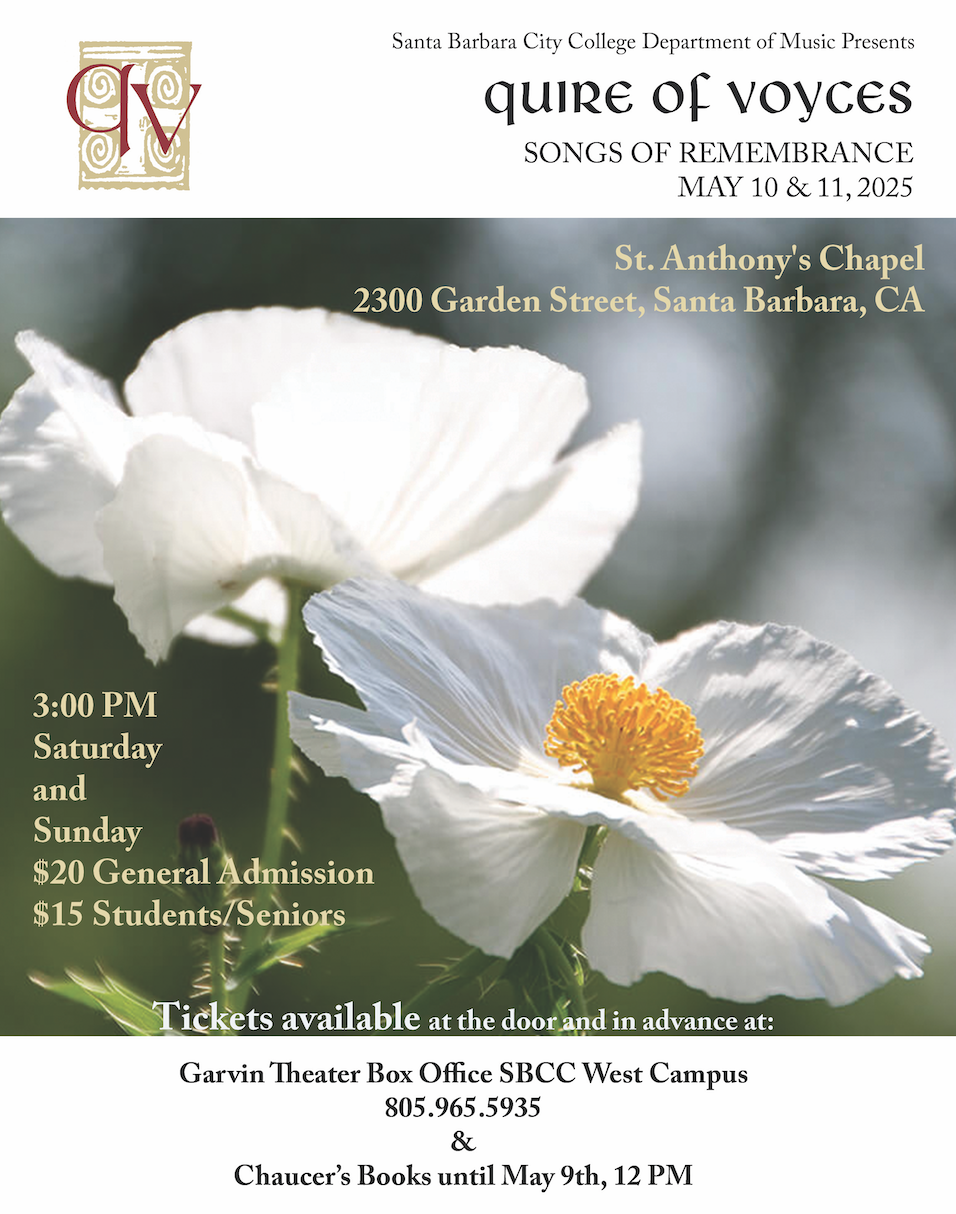 Join us for the Quire of Voyces “Songs of Remembrance” concerts on Saturday May 10th and Sunday May 11th at St. Anthony’s Chapel. 2300 Garden Street, at 3 pm both days. Immerse yourself in the enchanting world of sacred a cappella music as we convey messages of peace, love, blessings and memories to our cherished Santa Barbara community.