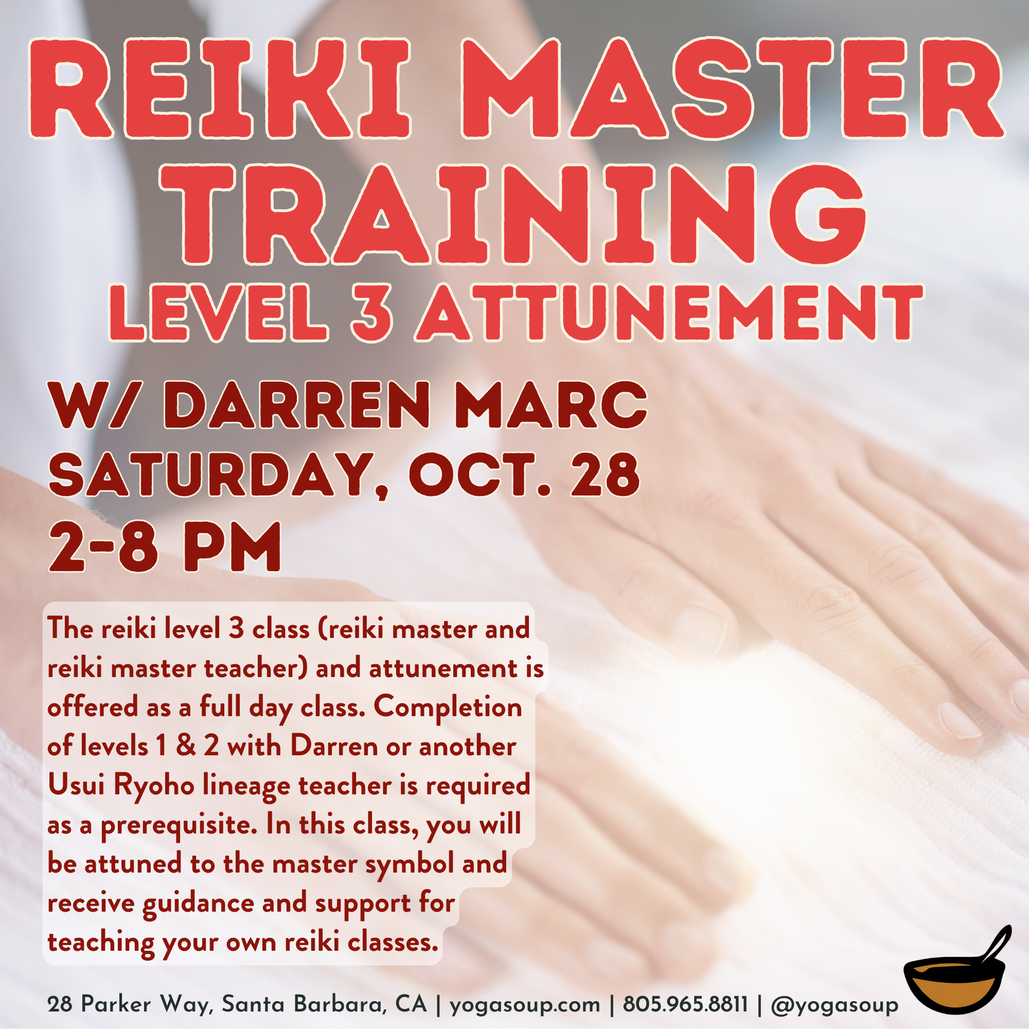 Included with this training will be an additional 1 hour private session for each attendee to help them prepare for attuning others to the reiki energy and teaching classes of their own. Also included will be opportunities to assist with future classes and reiki-sound healing events.