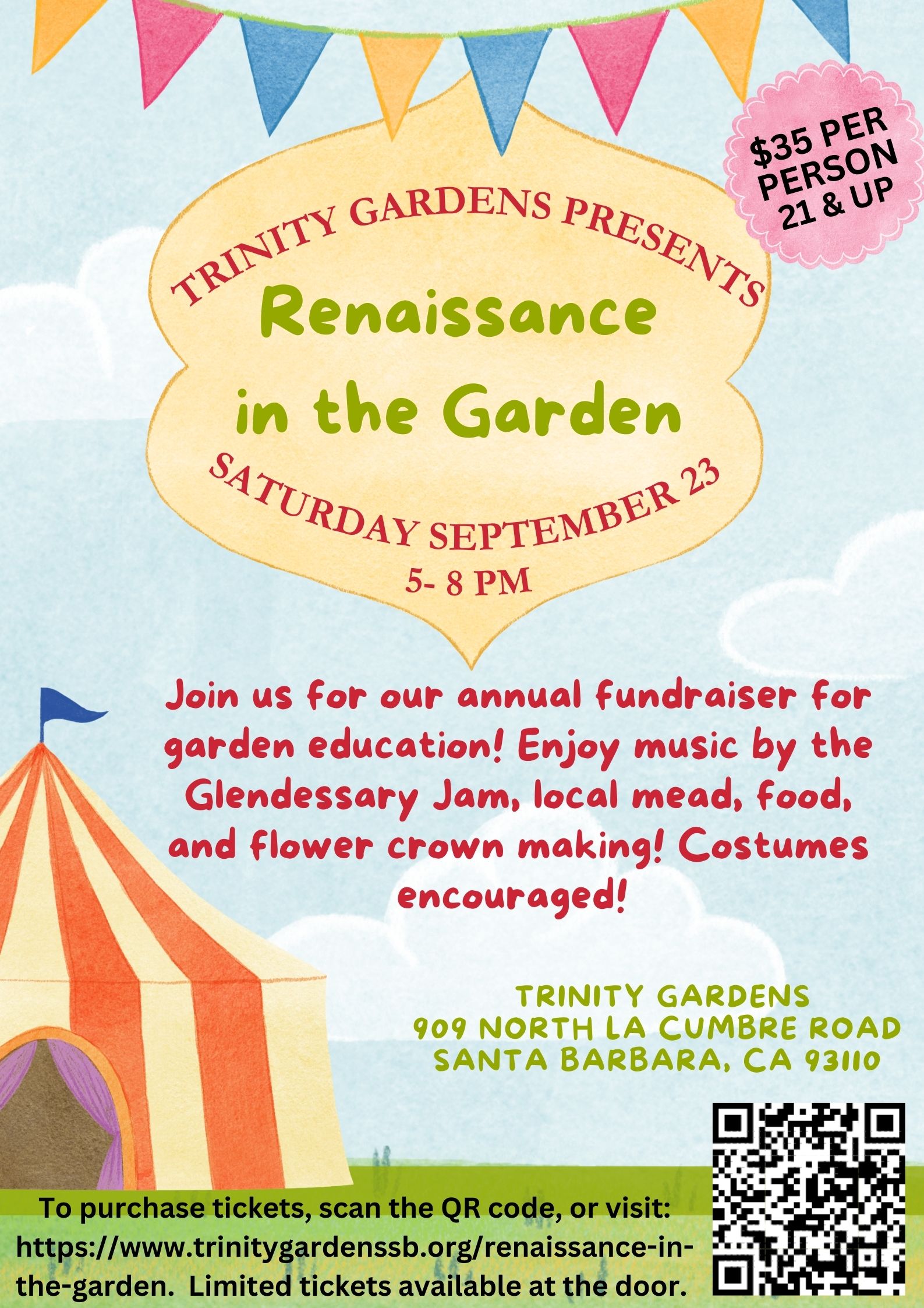 Trinity Gardens invites you to their yearly fundraiser for garden education, this year’s theme is “Renaissance in the Garden”. Join us for an evening of music by Glendessary Jam, local mead, food and crafts. This event is 21 + and Renaissance dress is encouraged. Limited tickets available.