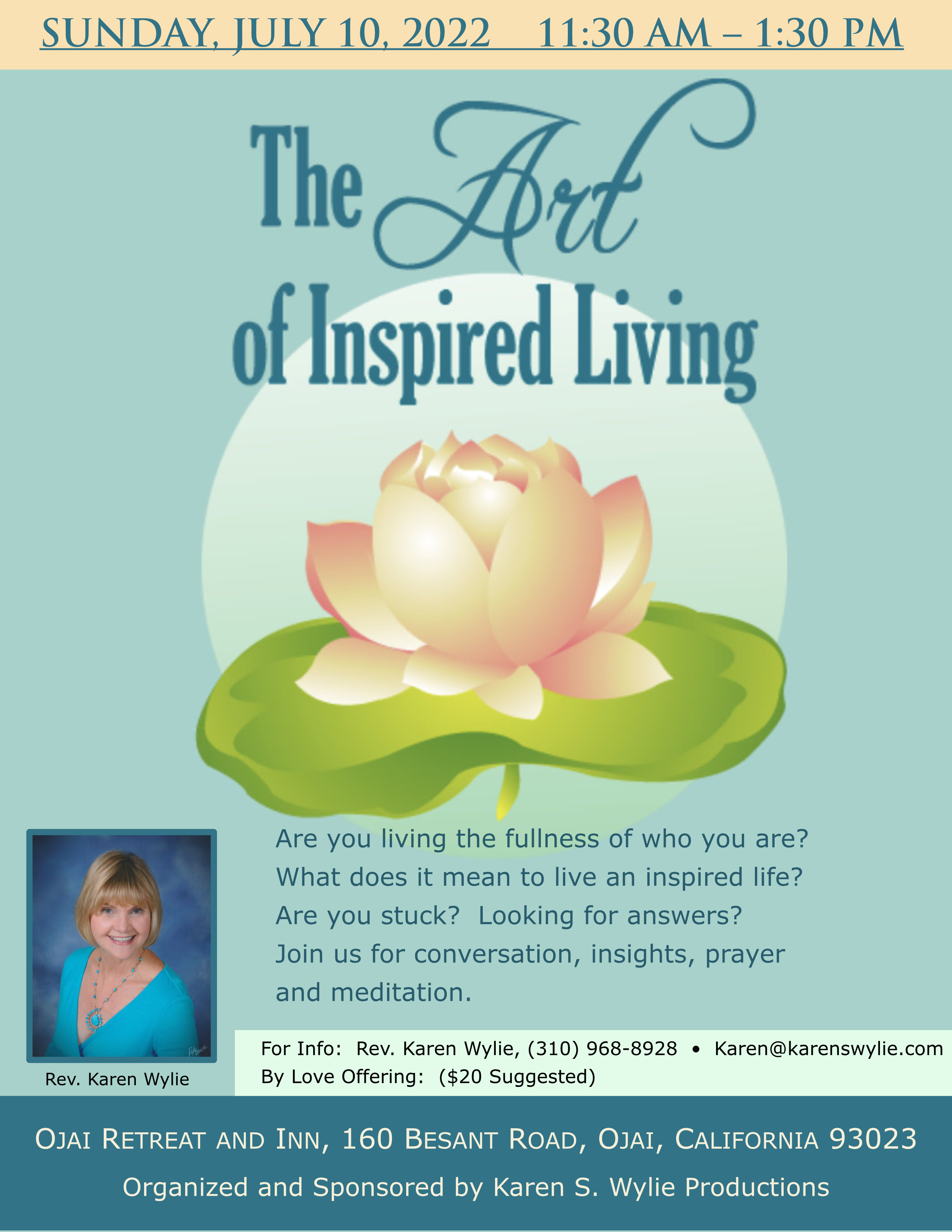 Join Rev. Karen S. Wylie at The Ojai Retreat on Sunday, July 10, from 11:30 a.m. – 1:30 p.m. The topic will be “The Art of Inspired Living.”