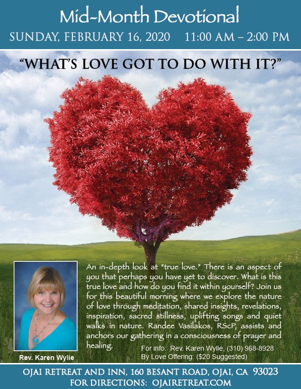 Join Rev. Karen S. Wylie at The Ojai Retreat on Sunday, February 16, from 11:00 a.m. – 2:00 p.m., for her Mid-Month Devotional Retreat, this month devoted to an exploration of love.