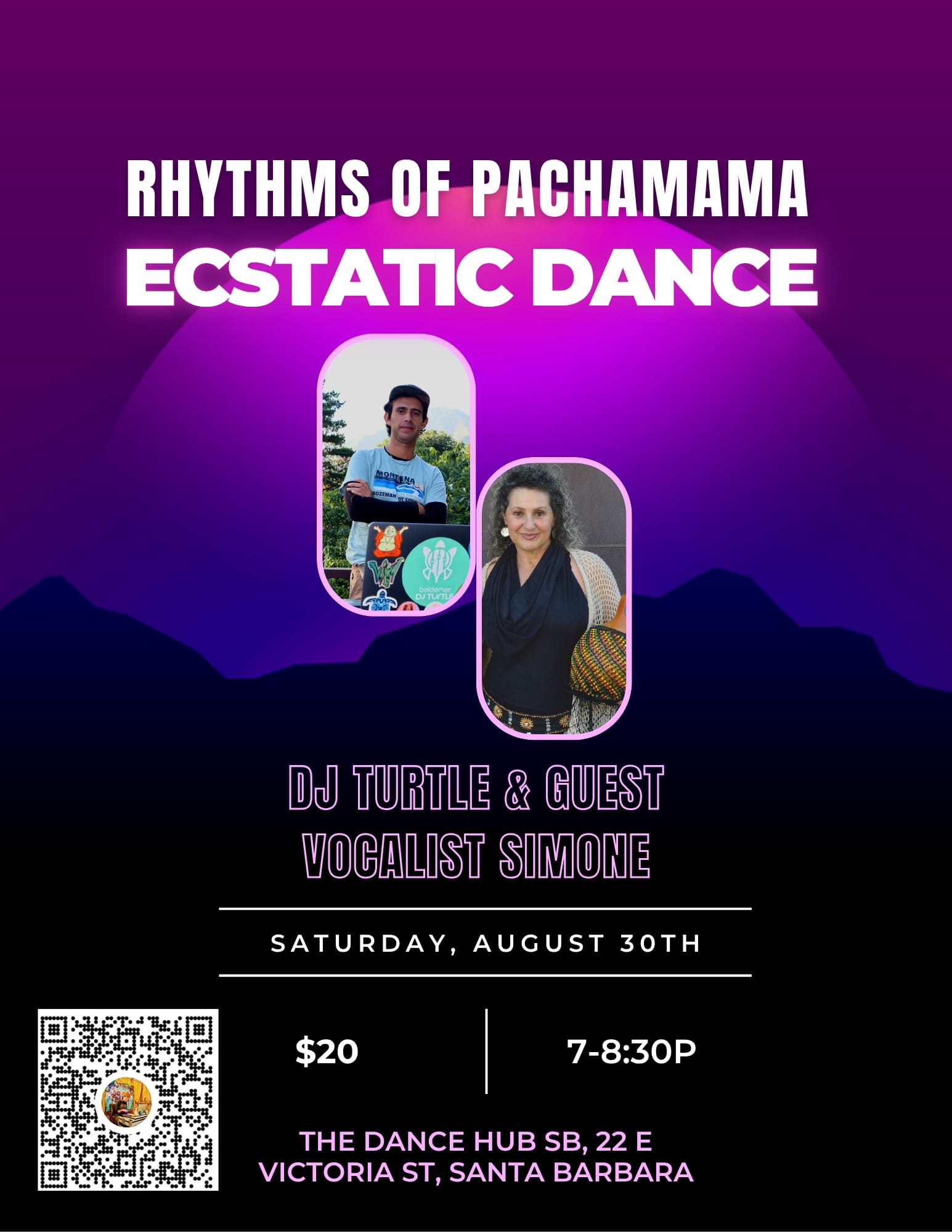 🌎 Ecstatic Dance: Rhythms of Pachamama Saturday, August 30 | 7:00–8:30 PM📍 The Dance Hub SB – 22 E Victoria St, Santa Barbara