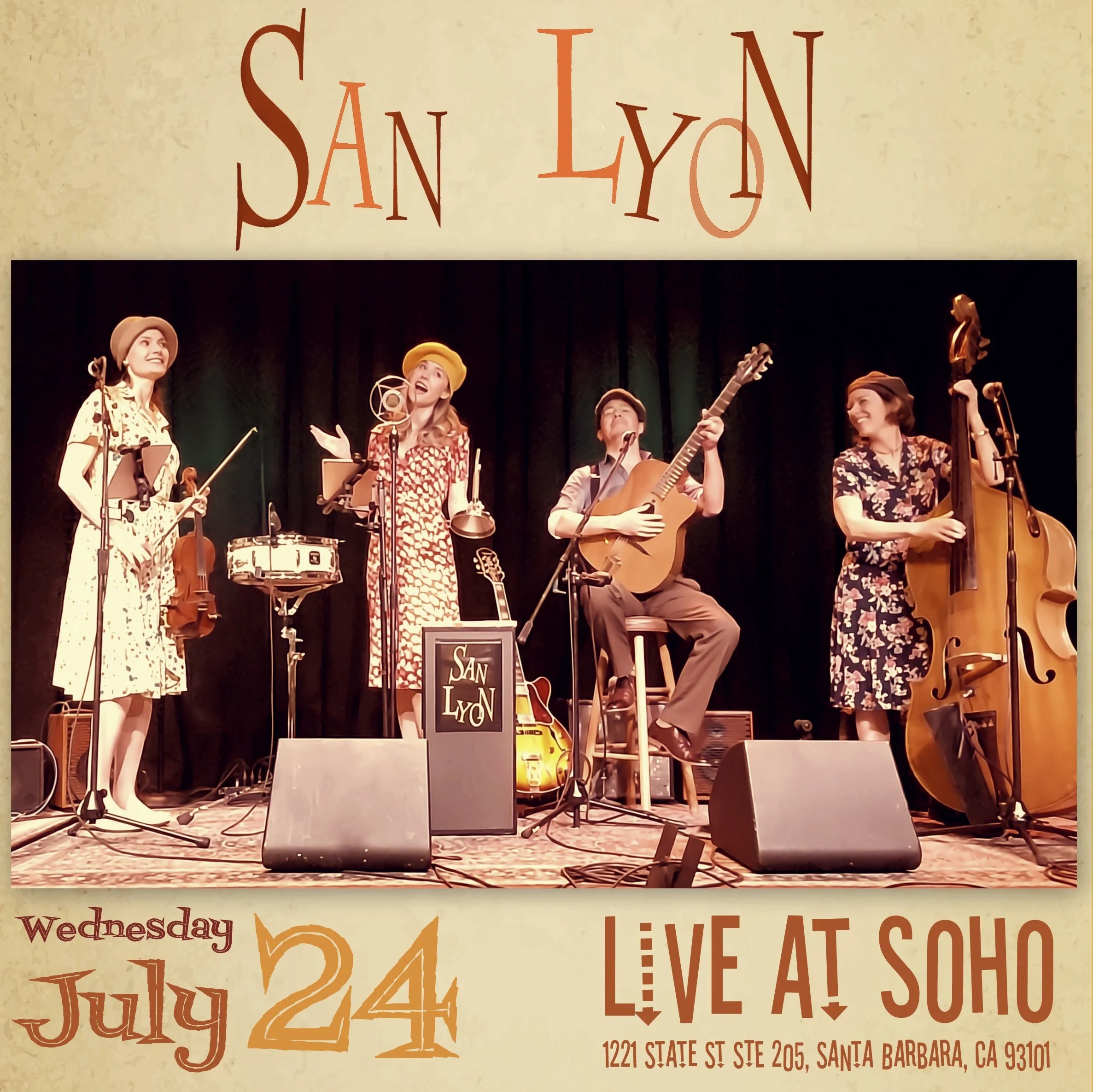 San Lyon is a colorful Gypsy Swing quartet. Their music is a mix of early 20th century Parisian Hot Club Gypsy Jazz and American Jazz standards from the 1920’s to 40’s, as well as original music. Please join us at SOhO for a night of fun!