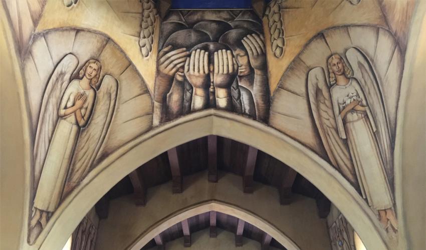 Image: Detail of Alfredo Ramos Martínez mural in the Chapel of the Santa Barbara Cemetery, 2019.