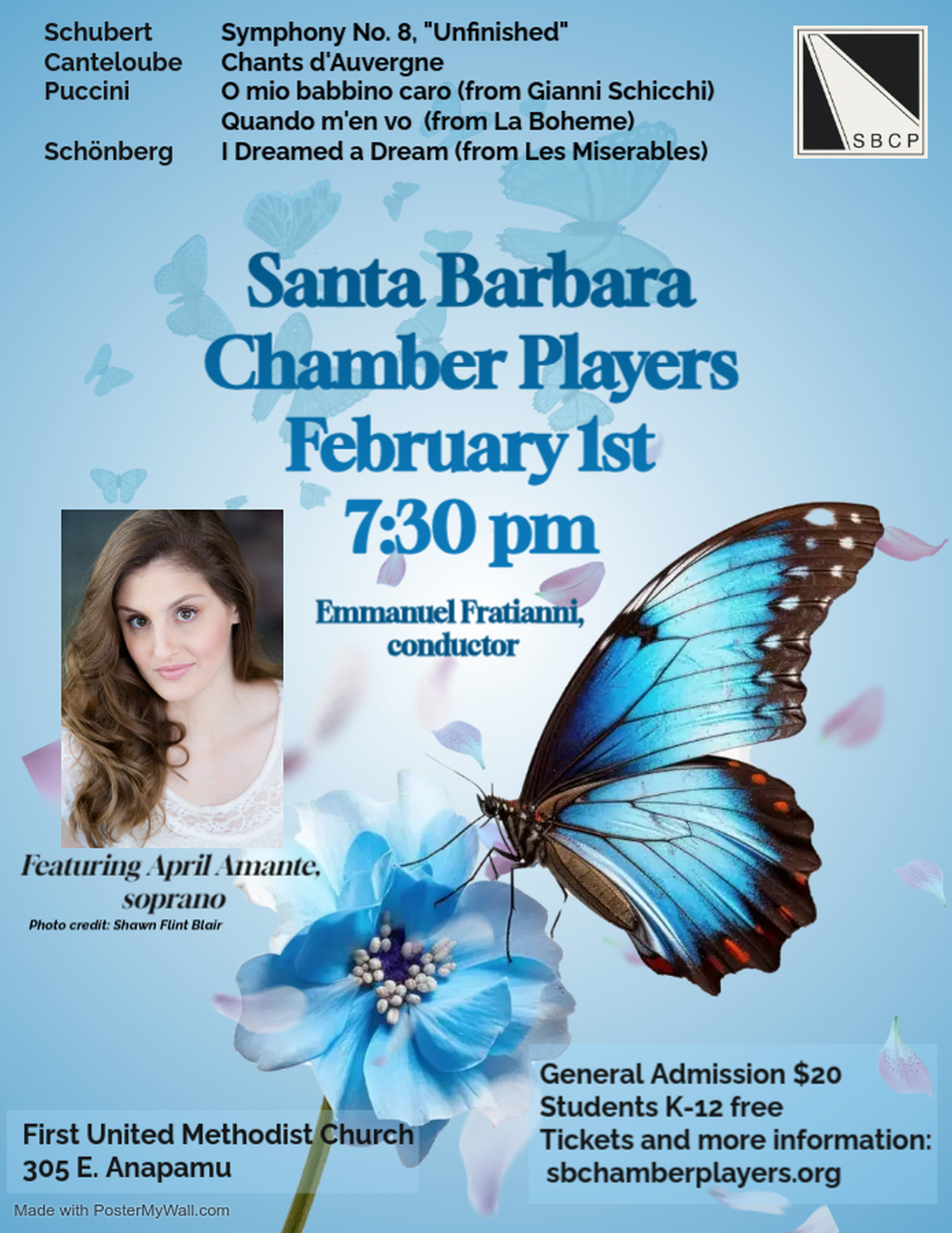Join the Santa Barbara Chamber Players under the baton of Emmanuel Fratianni on February 1st at 7:30pm at the First United Methodist Church, 305 E. Anapamu Street, for an amazing concert with Schubert Symphony No. 8, “Unfinished,” and a feature of vocalist April Amante on Canteloube’s Chants d”Auvergne, Puccini’s O mio babbino caro (from Gianni Schicchi), Quando m’en vo (from La Boheme), and Schönberg’s I Dreamed a Dream (from Les Miserable). Tickets are $20 with K-12 free at https://sbchamberplayers.org/.