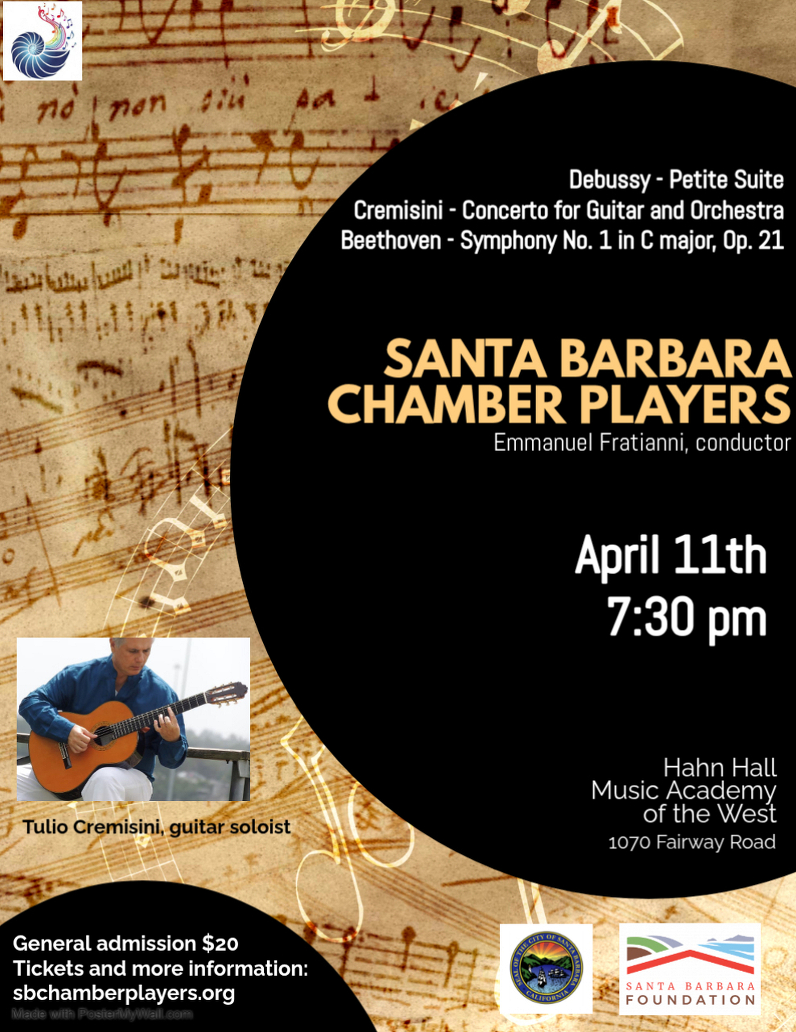 The Santa Barbara Chamber Players will be performing on Saturday, April 11th at 7:30pm at Hahn Hall at the Music Academy of the West, 1070 Fairway Road.
