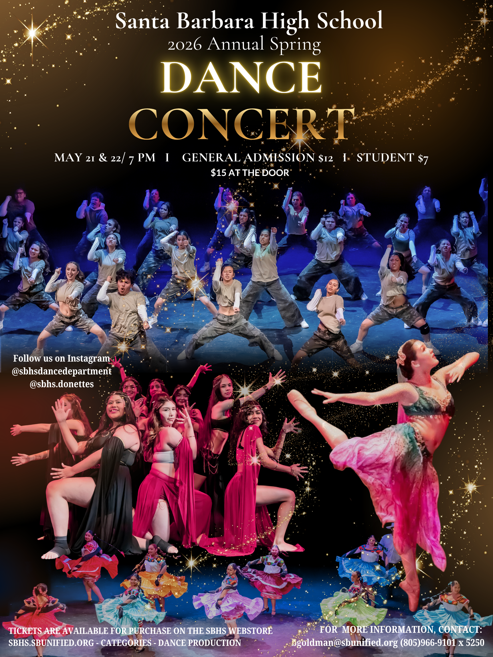 Come enjoy an inspiring evening that highlights the dedication, talent, and creativity of our amazing dancers. The concert will feature energetic performances in Hip Hop, Musical Theater Jazz, Contemporary Modern, Ballet, and Cumbia, along with special guest performances by the SBHS Folklórico Club, Class, and the SMHS Dance Team. It promises to be a lively and memorable showcase you won’t want to miss!