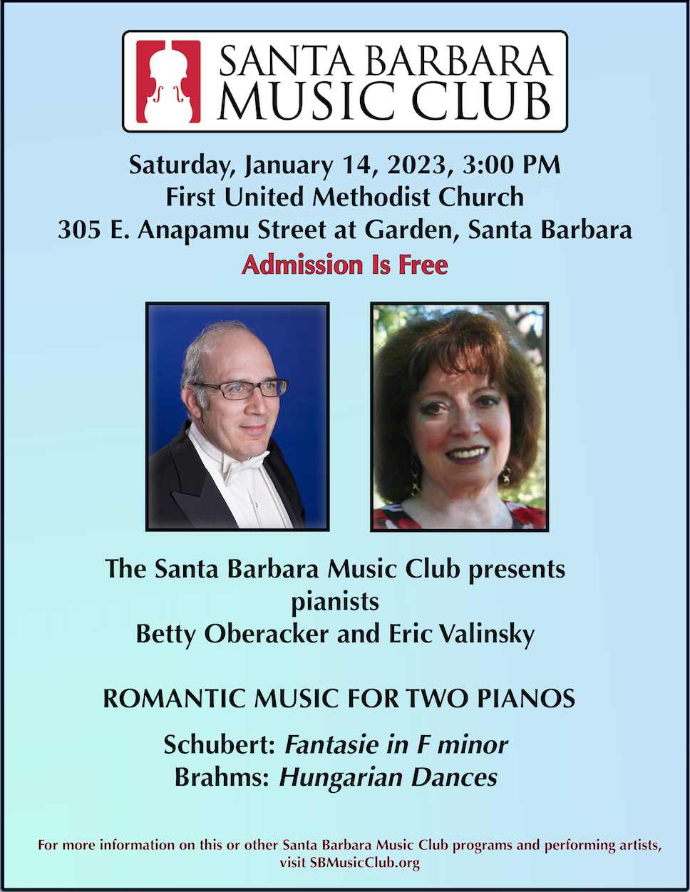 The Santa Barbara Music Club continues its 2022-2023 season of beautiful classical music on Saturday, January 14, 3 PM, at First United Methodist Church, 305 E. Anapamu. Admission is free.